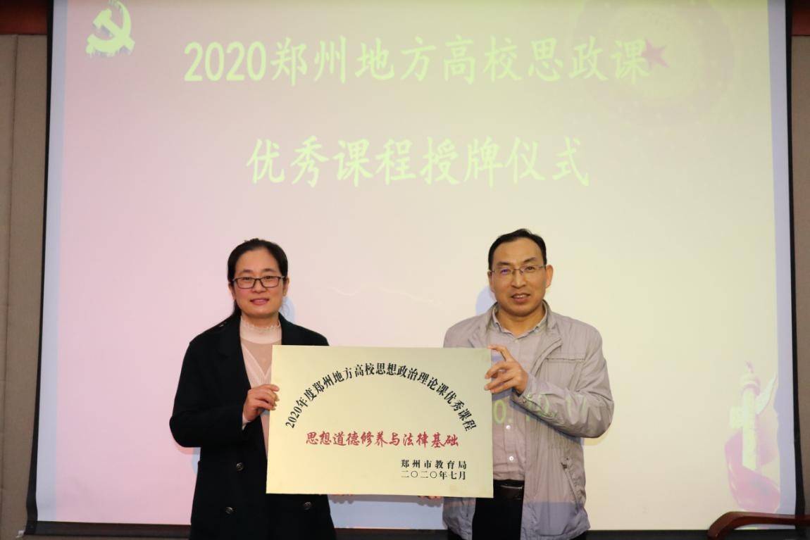 10月17日,课程负责人张秋燕参加了郑州市地方高校思政课教指委组织的优秀课程授牌仪式。郑州市教育局高教处处长郭玉兵为每个团队的负责人授予了优秀课程牌匾,郑州市地方高校思政课教指委负责人、郑州科技学院马克思主义学院院长王振国教授为大家颁发了荣誉证书。