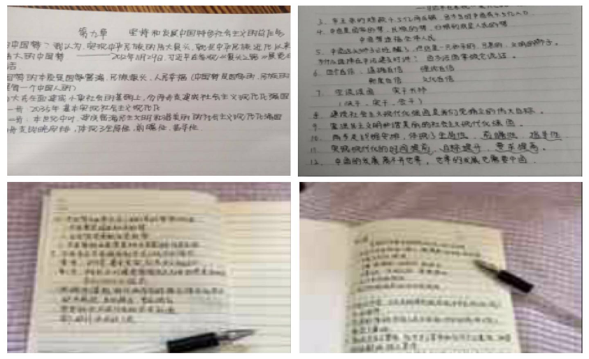 其中,概论课采取了让学生线上学习时记随堂笔记,并要求附上自己关于某个问题真正的思考和想法,返校后上交,作为线上课堂的考勤和表现评分依据,这样一来可以解决应付签到的问题,二来可以提高学生线上学习的获得感。