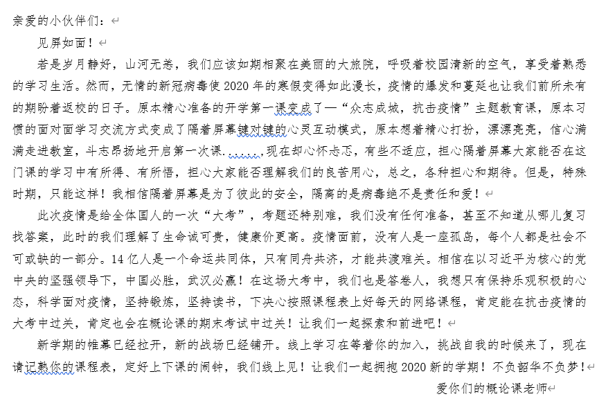《概论》和《基础》课程在第一次课前通过“线上一封信”,加强与学生的思想交流,让学生们在开展线上学习之前,对以后的学习有明晰的认识和了解,激发学生的学习兴趣。