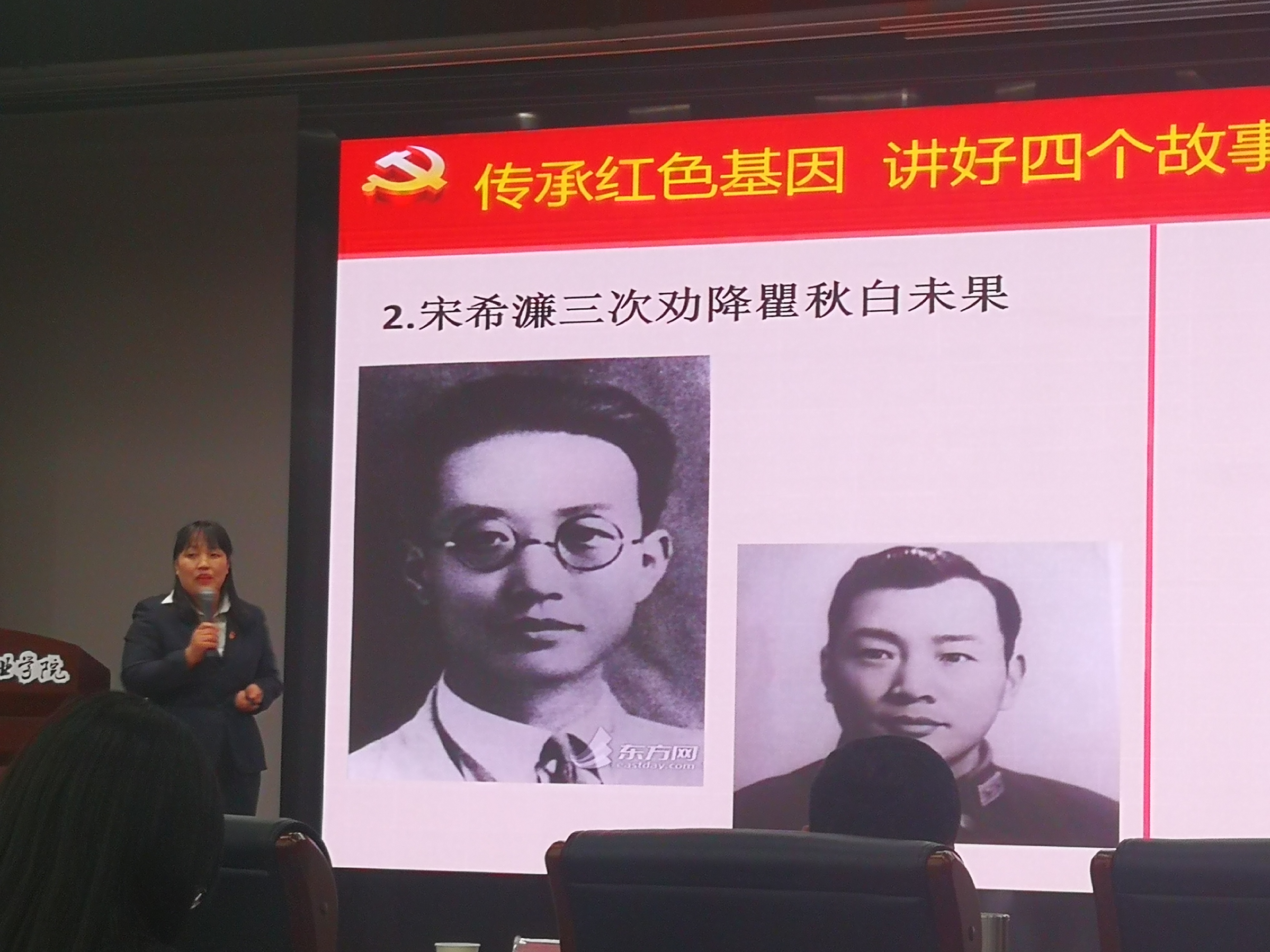 张秋燕和汤云飞两位老师分别以《“著名农民”的传奇故事》和《瞿秋白的故事》为题,进行了精彩讲述。她们的微党课既有理论深度、情感温度,又富有视野宽度和思想高度,展示了思政部教师强大的实力,征服了评委和观众,最后张秋燕老师荣获一等奖,汤云飞老师荣获二等奖。