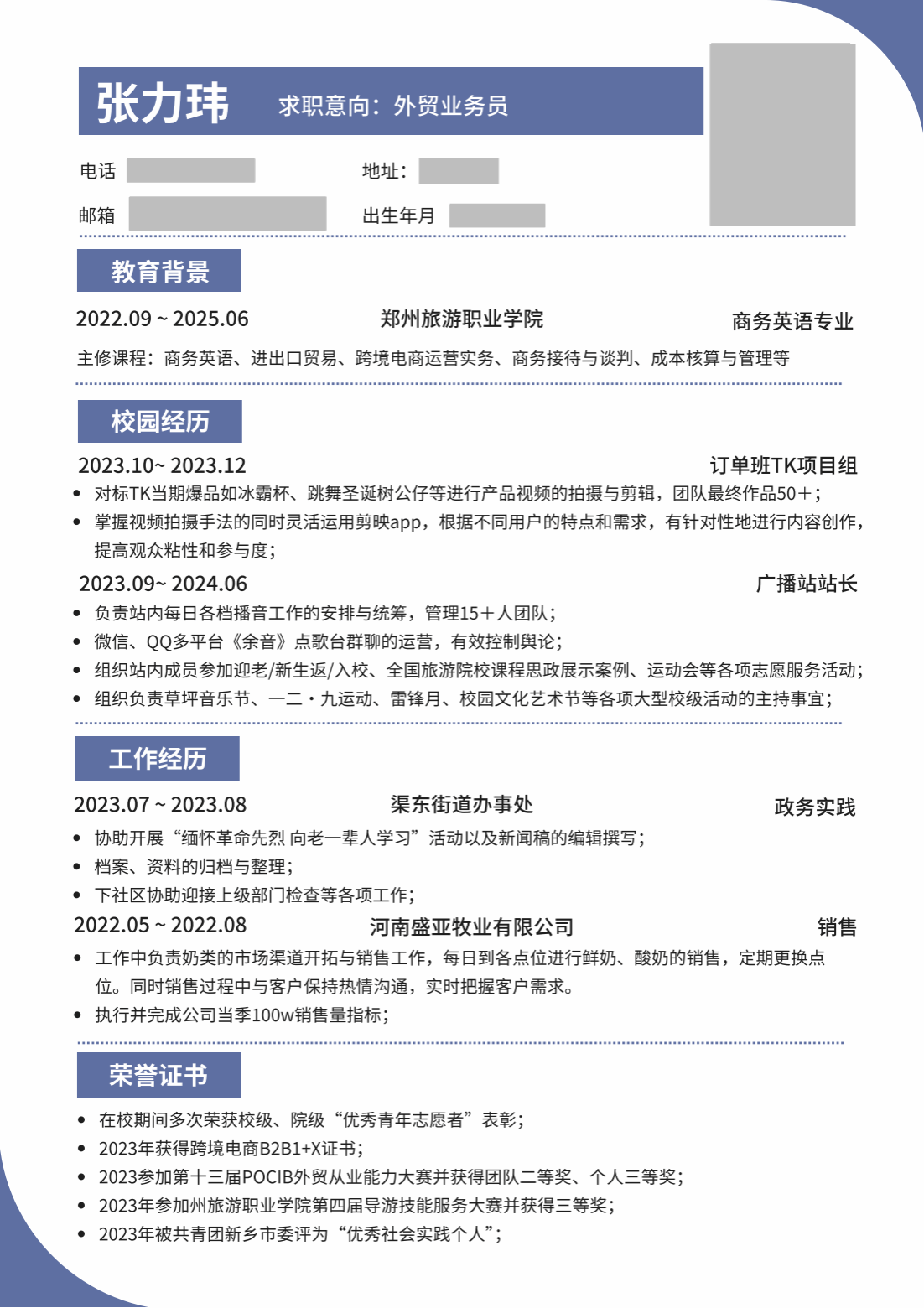 22级商务英语1班 张力玮 求职意向:外贸业务员