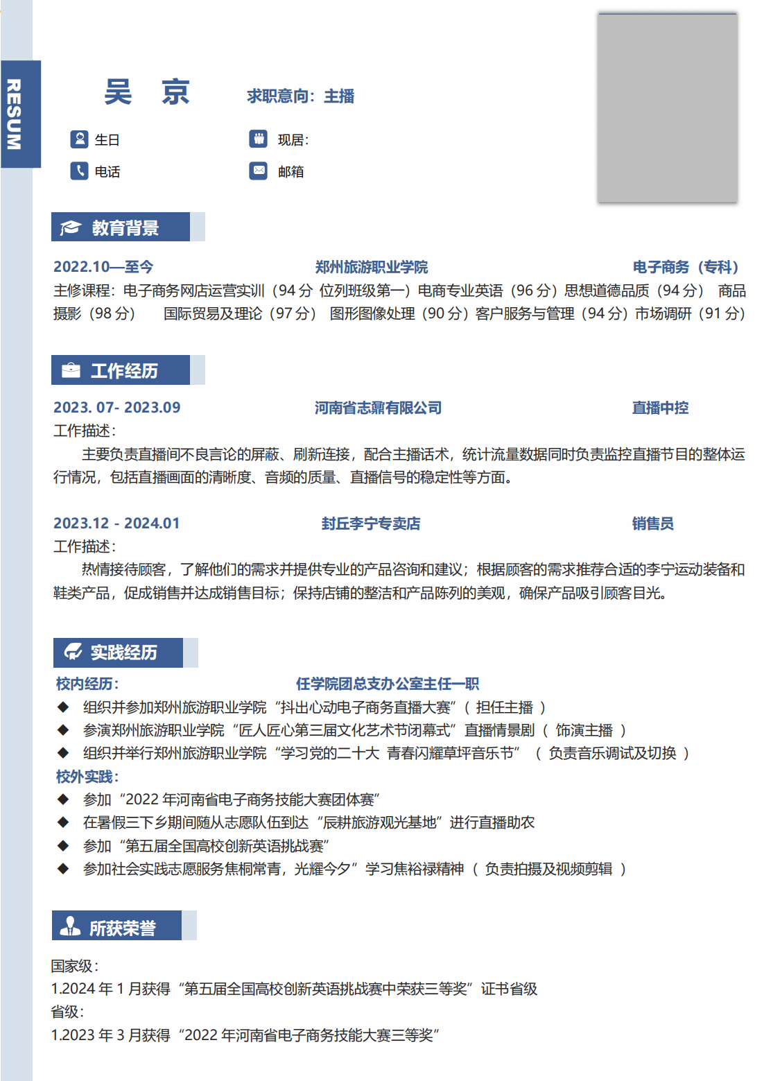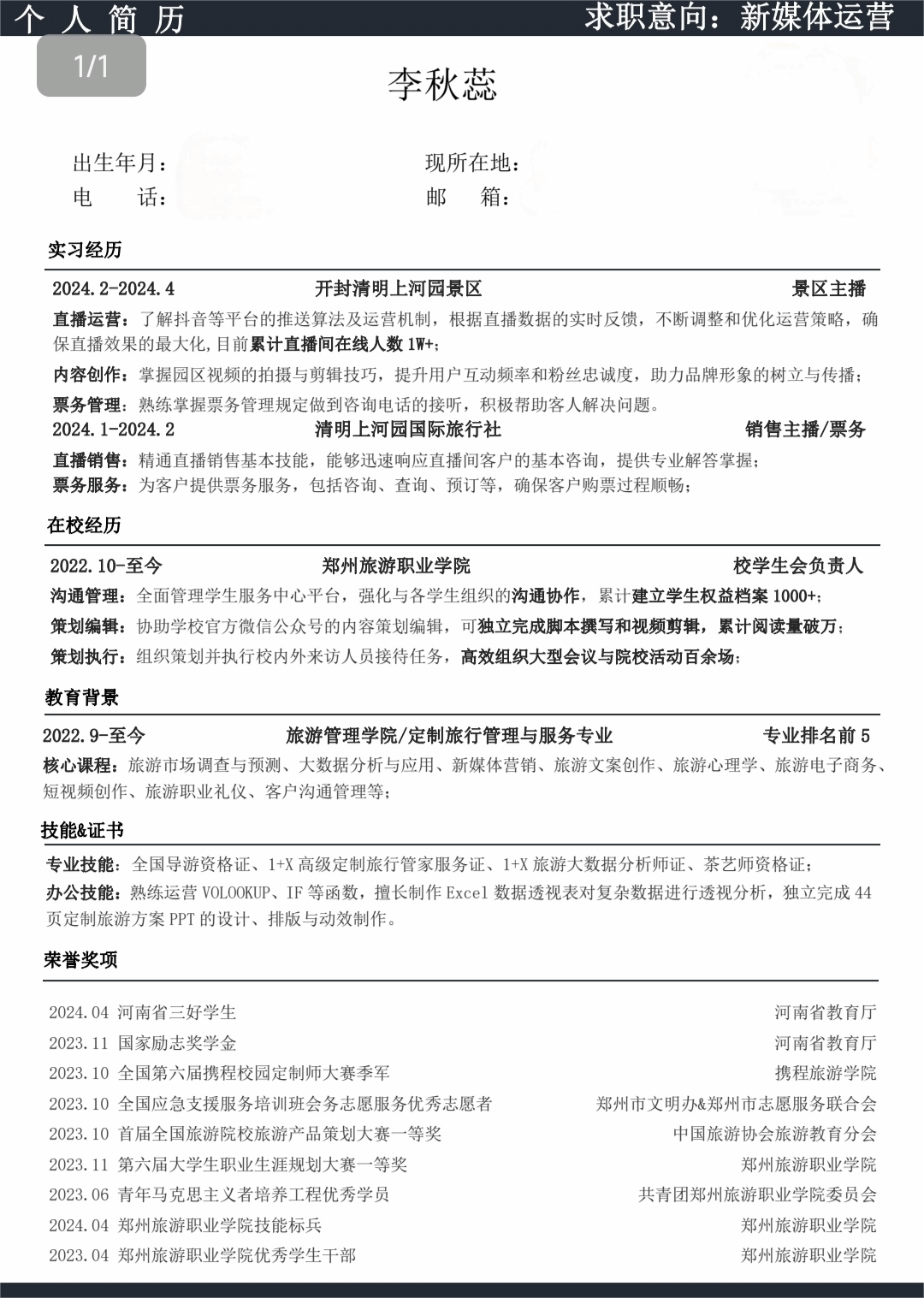 22级定制旅行班 李秋蕊 求职意向:新媒体运营