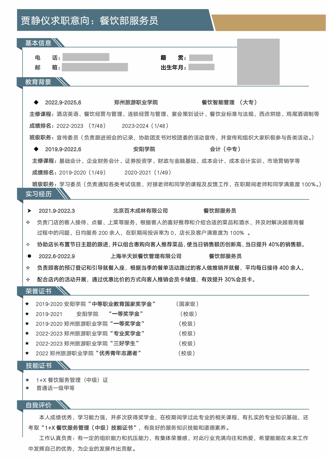 22级餐饮智能管理1班 贾静仪 求职意向:餐饮部服务员