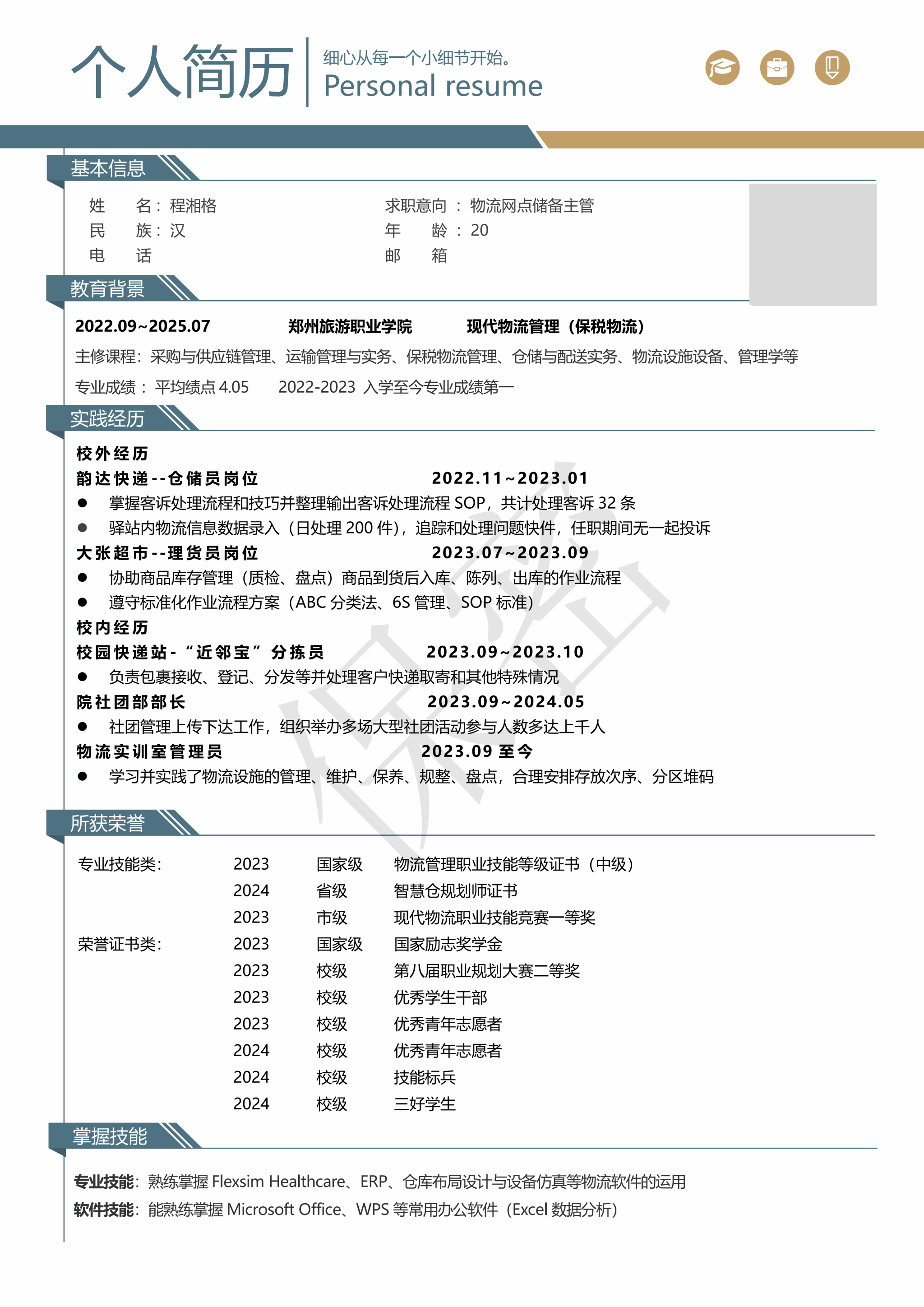 22级保税物流管理1班 程湘格 求职意向:物流网点储备主管