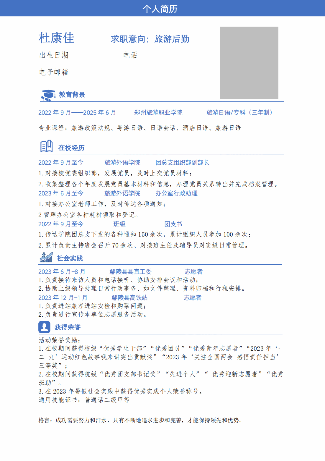 22级旅游日语1班 杜康佳 求职意向:旅游后勤