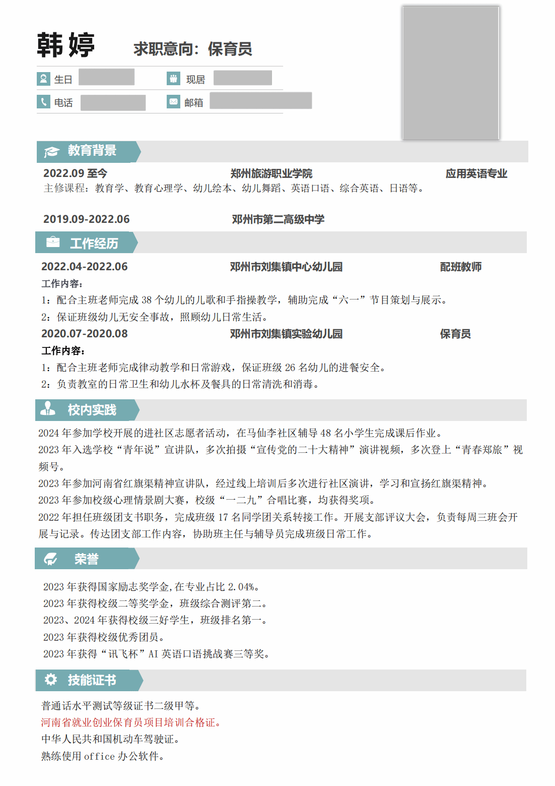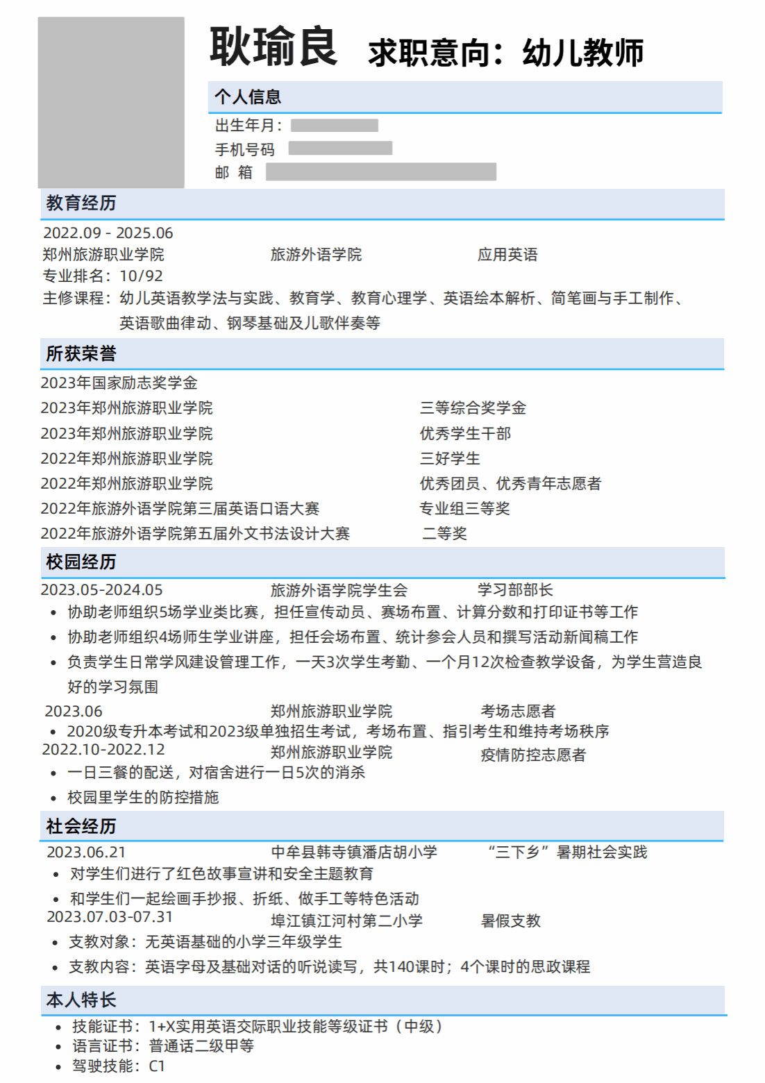 22级应用英语2班 耿瑜良 求职意向:幼儿教师