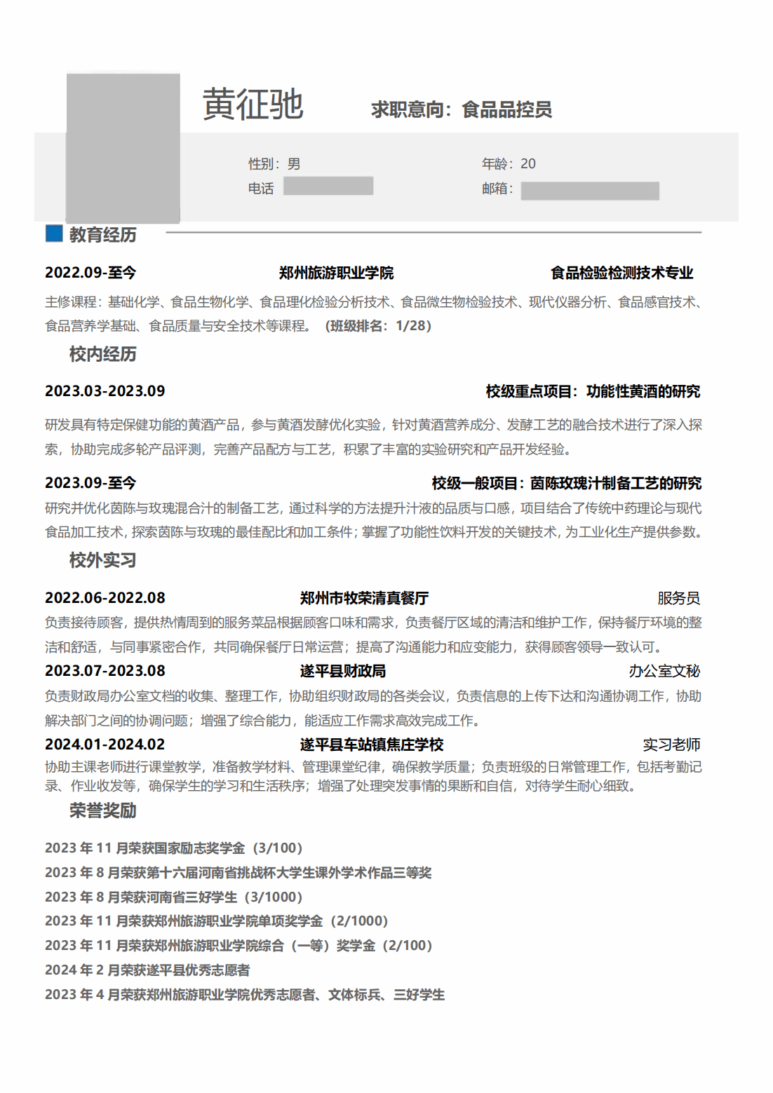 22级食品检验检测技术2班 黄征驰 求职意向:食品品控员
