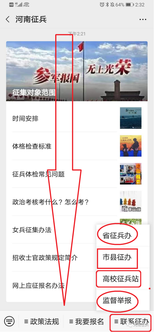 1.电话咨询:各市、县(市、区)征兵办公室和高校征兵工作站电话,请关注并进入微信公众号“河南征兵”点击下方“联系征办”查询;
