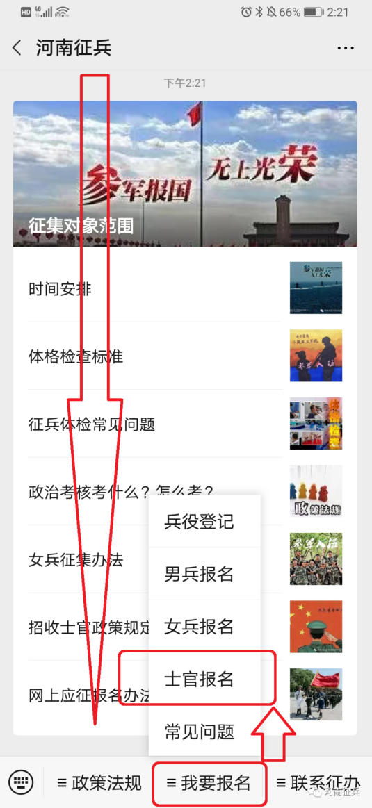 另一种是,关注并进入微信公众号“河南征兵”(微信号:henanzhengbing)点击下方“我要报名”,按要求真实、完整填写基本信息。