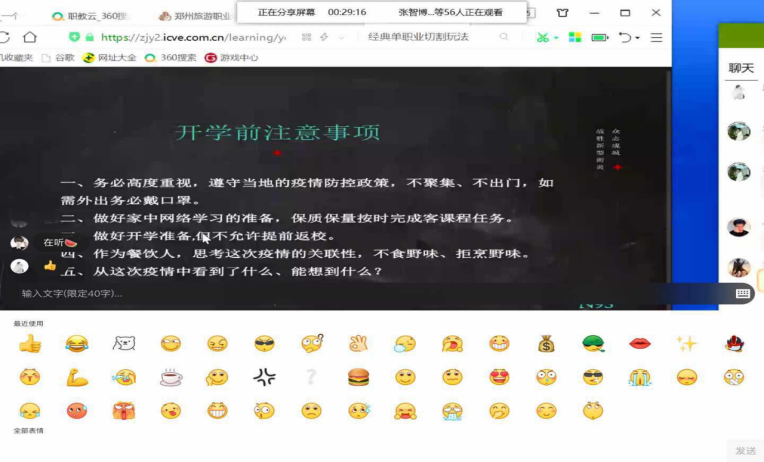 最后通过班主任与辅导员的精心准备与组织,给同学们上了一节特殊的班会,许多班主任给学生们分享了疫情期间的注意事项,病毒的相关知识,并为学生做心理辅导,分享疫情期间的在这个特殊的寒假里的收获,鼓励他们正确面对疫情,以饱满的精神迎接新学期的到来。在未返校前要按时进行线上学习,疫情时期,虽然无法见面,但在老师们的精心准备和共同努力下,通过线上学习、多彩课程等各种方式,让同学们体验到非常时期全新的学习模式,保障学生的学习不受疫情影响。
