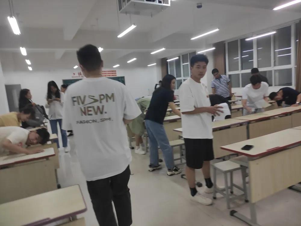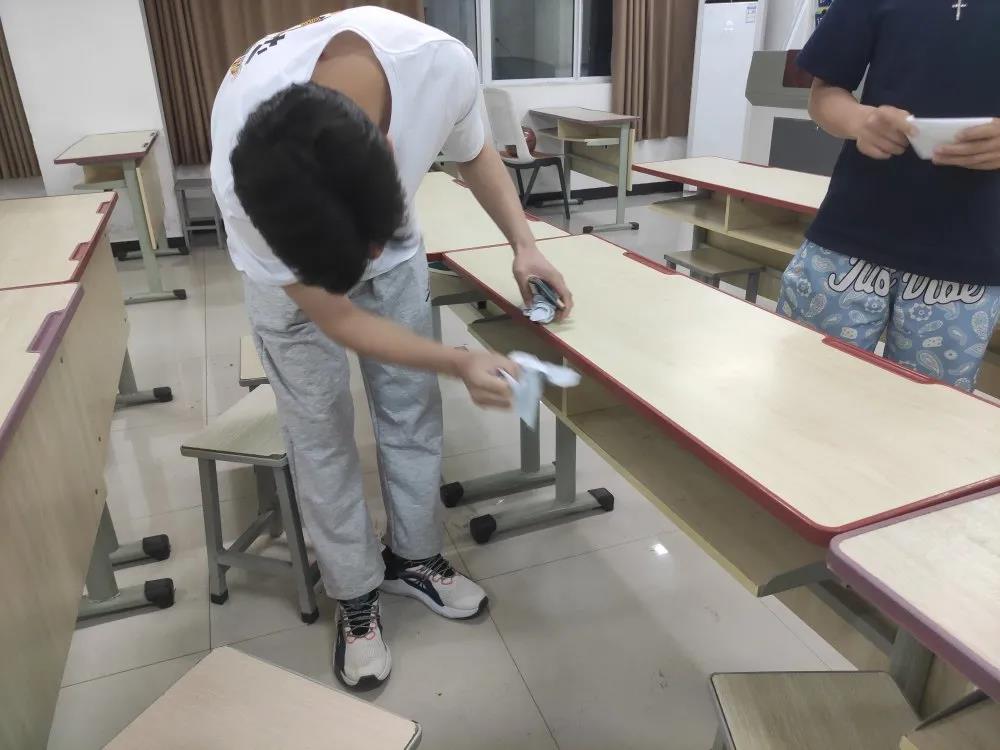 大家分成了8个小组,每个小组分别负责清扫1-2间教室。他们清扫了课桌抽屉里与地面的垃圾,将黑板擦拭干净,并整理了讲桌。针对课桌面上难以清洁的划痕和笔迹,大家先用水将其打湿后,用抹布一遍遍细心清理,直至清除干净。在大家的共同努力下,课桌、黑板、讲桌、窗户等都变得干净整洁,整个教室窗明几净。打扫结束后,他们温馨提醒上自习的同学养成“随手捡、随堂清”的好习惯,共同创造干净舒适的学习环境。