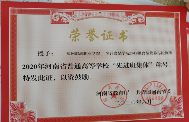 2019年6月,杨紫鹤同学担任烹饪食品学院“团总支副书记”一职,在她的带领和同学们的共同努力下,2018—2019学年中获得系部“红旗团支部”,2019-2020学年获得河南省“先进班集体”。