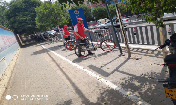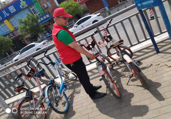 志愿者整理街道杂乱的自行车