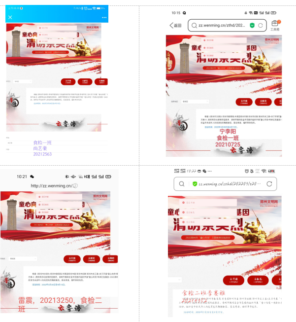 根据《郑州市文明办郑州市教育局共青团郑州市委郑州市妇联郑州市关工委<关于开展“童心向党”教育实践活动的工作方案>》,2022年4月2日10点至10点30分,烹饪食品学院开展“童心向党•传承红色基因—2022清明祭英烈”活动,向先贤先烈鞠躬献花、签名寄语,缅怀革命先烈。