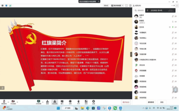 为了弘扬伟大的红旗渠精神,纪念和景仰红旗渠工程先辈,为当代青年树立精神标杆,坚定青年理想信念,烹饪食品学院于12月7日在线上组织全体在校生开展“红旗渠精神进校园”主题线上班会,皆在增强同学们对红旗渠修建过程的了解,激发他们学习红旗渠精神、践行红旗渠精神的热情。