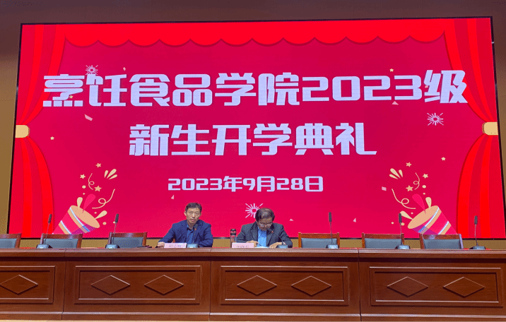 9月28日上午,烹饪食品学院在2B教学楼报告厅举办了2023级新生开学典礼,党总支书记胡志霞、院长李晓东、办公室主任李彬、各教研室主任、新生辅导员班主任,还有全体2023级新生参加了本次活动。