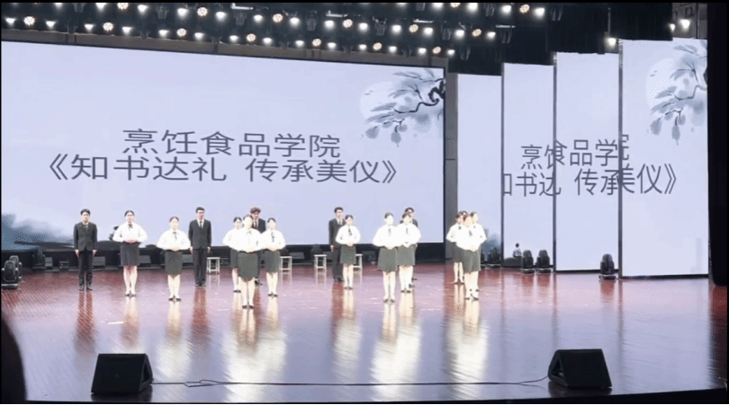 第一环节为文明礼仪风采展示《礼仪操知书达理,传承美仪》,礼仪队服装整齐,步伐划一,举止优雅,以饱满的精神状态展现出文明礼仪的风采。第二环节为文明礼仪情景剧《文雅之堂以礼相待》,我院结合中餐用餐礼仪,设计演绎情景剧,博得台下观众们的阵阵喝彩,展示了用餐基本礼仪、餐具使用方法、桌面文化等知识,向同学们普及了中国传统餐饮文化。最终,在指导老师和参赛同学的共同努力下,烹饪食品学院荣获三等奖。