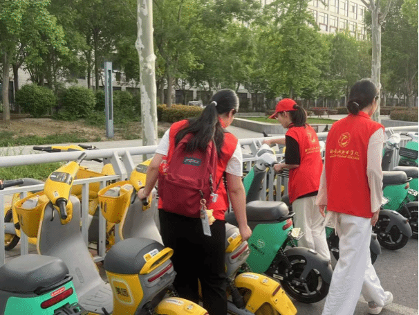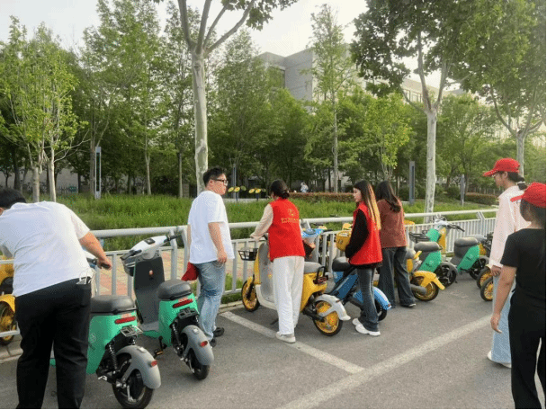 活动过程中,同学们沿着学校南门周边街道,对随意停放的共享单车进行统一整理。同学们两人一组,将歪倒的单车扶正,把零散停放的单车排列整齐,确保车辆停放规范有序。