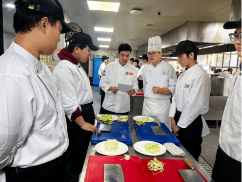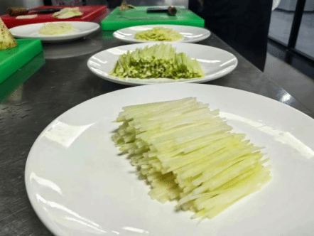 在此次赛项初选上,专业教师首先进行了选拔流程和评分标准的宣讲,鼓励学生稳定发挥。初选内容分为赛场素养和基本功两部分,同时考察语言能力、应变能力、抗压能力和操作技能。在基础刀工考核中,初选要求候选人在规定时间内将萝卜成丝、丁、片等形式,并考核规格、均匀度和速度。在面点基本功方面,重点考察候选人和面、揉面、搓条、下剂、制皮等基础手法。