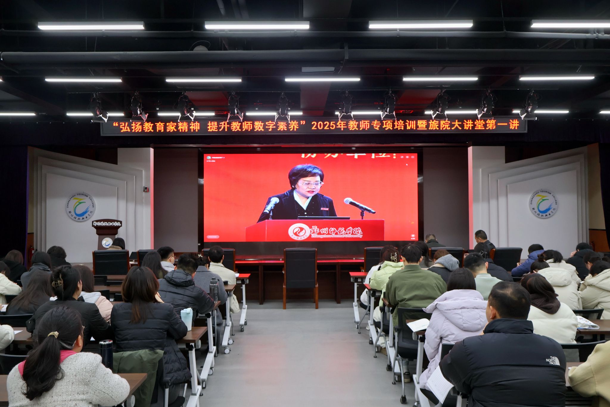 为深入学习贯彻习近平总书记关于教育的重要论述和全国教育大会精神,落实《河南省教育厅办公室 关于做好教育家精神 2025年巡回宣讲活动有关工作的通知》要求,pp电子于2月26日组织开展了“弘扬教育家精神,提升教师数字素养”教师专项培训暨旅院大讲堂活动。本次活动,旨在引导教师深刻领会教育家精神内涵,激发教师践行育人使命的热情,提升教师数字素养,推动教育教学改革与创新。校党委委员、副校长徐永清主持,校党委书记王艳红、纪委书记詹晓娅出席讲座。