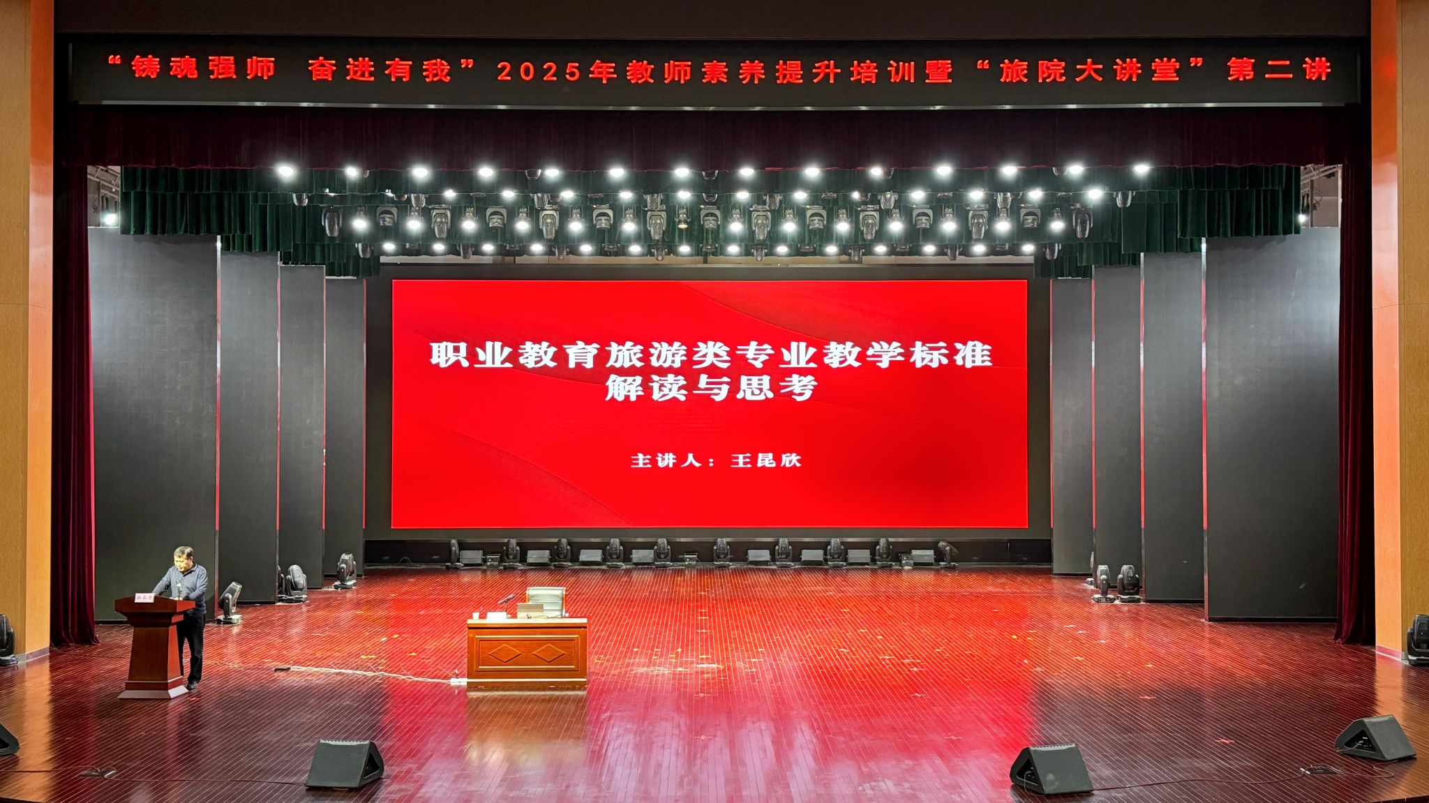 为深入贯彻落实新时代职业教育发展理念,进一步铸牢教师理想信念之魂,强化教师教育教学能力,4月16日下午,pp电子在艺术中心举办“铸魂强师 奋进有我”2025年教师素养提升培训会暨“旅院大讲堂”第二讲活动,邀请浙江旅游职业学院教授、教育部全国旅游职业教育教学指导委员会副主任委员王昆欣作《职业教育旅游类专业教学标准解读与思考》专题报告。校长肖世才、党委副书记詹晓娅、副校长毛艳,纪委书记莫方勇出席,全校教职工参加培训。副校长徐永清主持培训会。