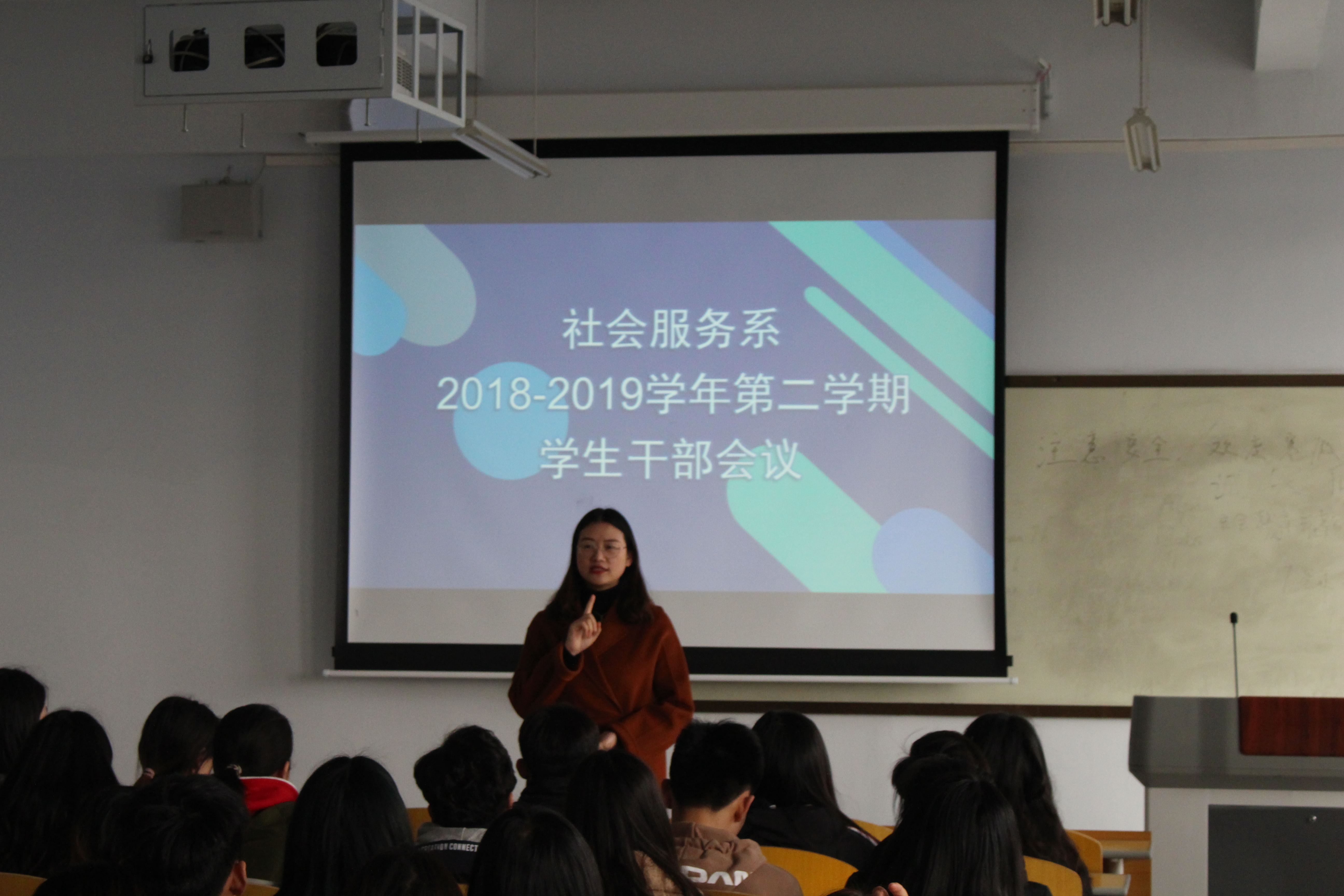 寒假的脚步渐行渐远,我们迎来了新的学期,社会服务系于2019年2月24日在1号教学楼507教室举行了“2018—2019学年第二学期学生干部会议”。出席本次会议的有系主任李俊、副主任刘兆坤、团总支书记段会利以及社会服务系全体学生干部。