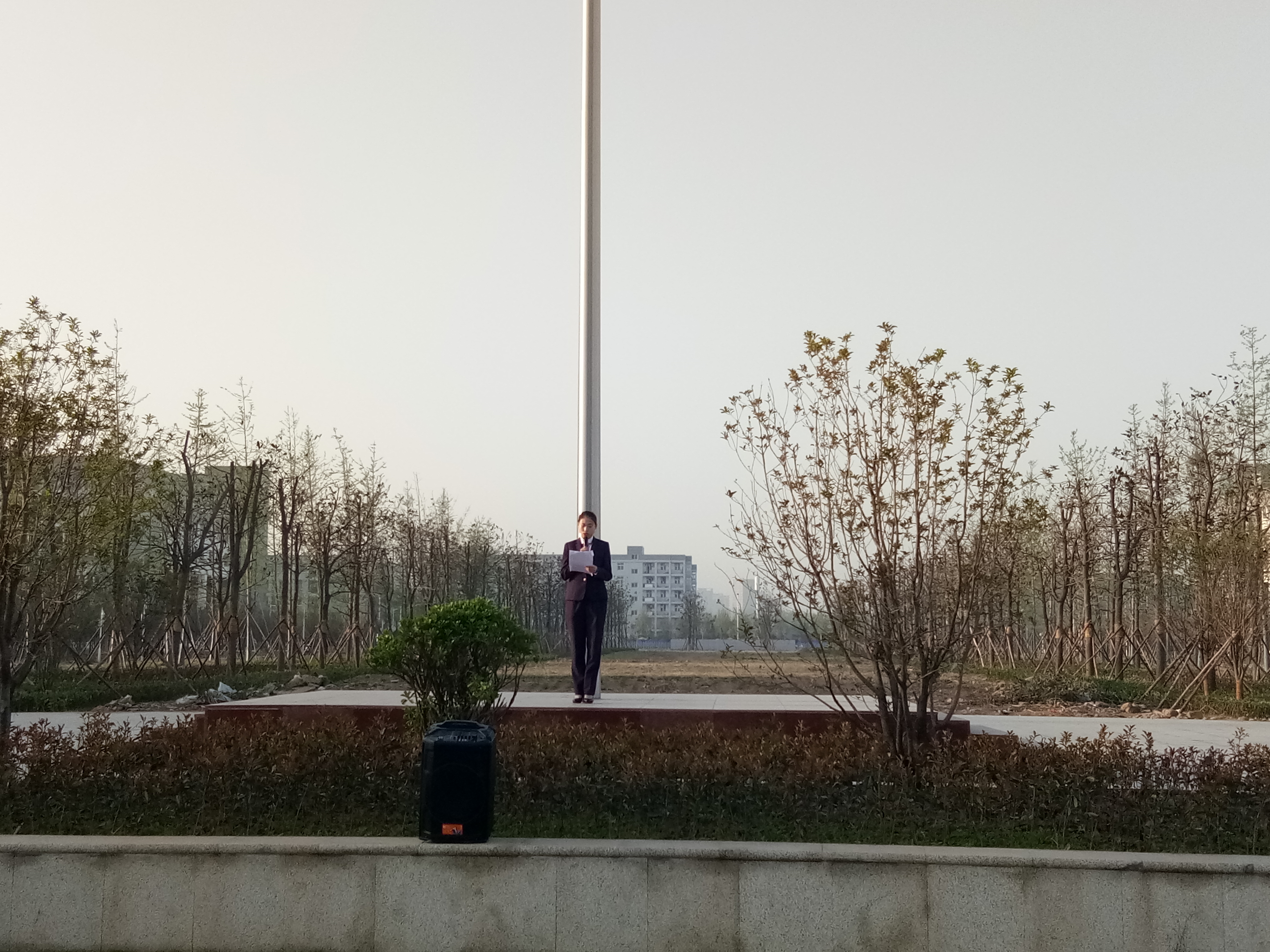 伴着清晨的第一缕阳光,社会服务系的同学们早早的起床来到行政楼前等待升国旗仪式的开始。当主持人宣布升国旗后,英姿飒爽的升旗手抬着那鲜红的国旗走到国旗台前。当国歌响起的那一刻同学们齐刷刷地抬头仰望着国旗行注目礼。我相信在看着国旗升起的那一刻,国旗台下的我们都在为祖国的发展而骄傲。接着就是学生代表发言了,首先为我们演讲的是社会服务系学生会纪律卫生部张晗为我们总结了本部门的工作以及对日后的工作提出了要求;接着生活部的郑皓月同学又跟我们分享了她工作以来感想。大会的最后刘兆坤书记对本次大会进行了总结发言,他要求我们遵纪守法,严格遵守系里的规矩。