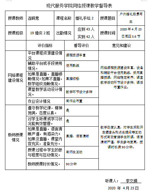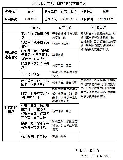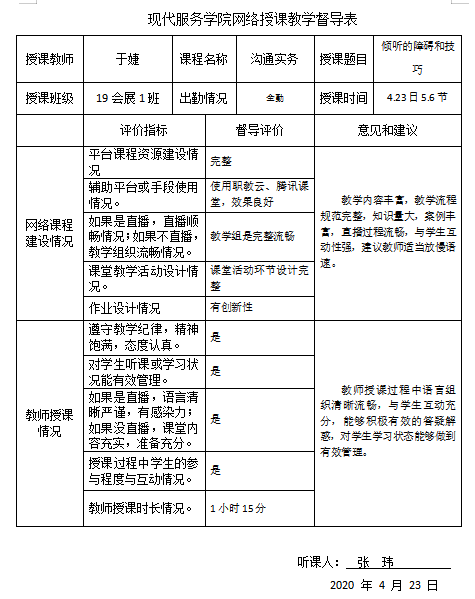 本周是网络教学的第九周。我系教学督导小组认真听取郑蕊、于婕、邵小明、连晓意四位老师的网络课程教学,四位老师一如既往的认真授课,在课堂上利用职教云和直播平台,通过丰富的教学资源、案例讲解、交流互动等设计,充分发挥了教师能动性,将教学内容融会贯通,同时利用各种激励手段调动学生积极性,最大程度的保证学生在课堂上对专业知识的掌握和领会。