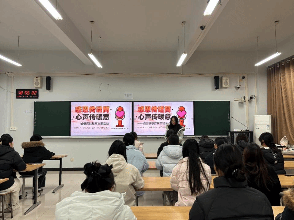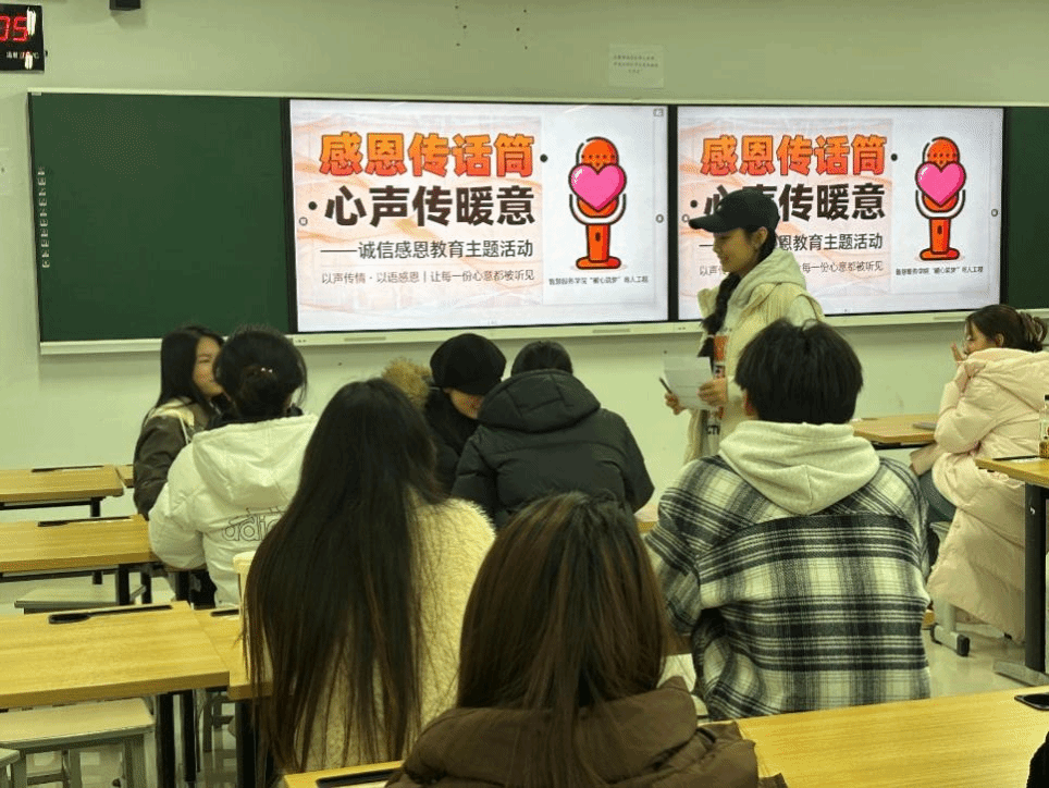 为了使感恩理念真正走进学生心里,让学生在解读、传递感恩相关内容时,主动思考感恩的内涵,唤醒对父母、师长、同学及身边人的感恩之情。我院于12月10日在1A609教室举办了“感恩传话筒 心声传暖意”主题活动。
