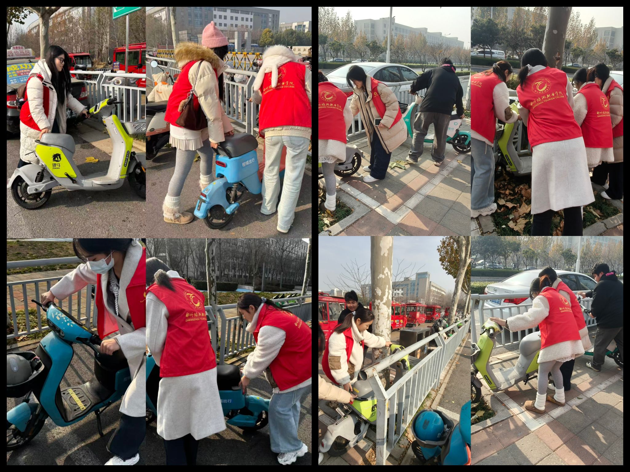 为深化青年志愿者的社会责任意识与服务奉献精神,引导青年以实际行动参与城市文明共建,展现新时代青年的担当与风采,智慧服务学院于2025年12月10日组织开展了摆放共享单车志愿实践活动。