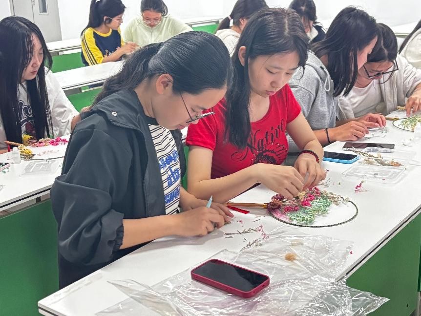 在团扇制作环节中,同学们热情高涨,社团成员为同学们准备了丰富的材料,有各种精美的扇面、干花以及丰富多样的装饰材料,大家一边制作,一边交流心得,现场气氛热烈融洽,经过一番精心制作,一把把独具特色的团扇在大家手中诞生,每一把都凝聚着同学们的想象和对传统文化的热爱。