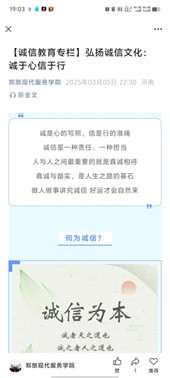 学院利用新媒体矩阵进行宣传,在微信公众号推出“诚信教育专栏”,发布诚信故事、诚信名言、法律法规解读及典型案例,打造清朗网络环境,扩大宣传覆盖面,以图文并茂的形式扩大覆盖面,提升学生的参与度和认知度。