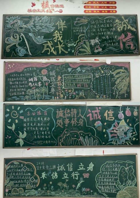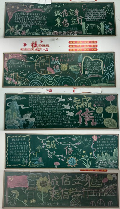 在教学楼通过展板和黑板报的形式宣传诚信典型,以潜移默化的方式深化育人效果。活动期间,同学们积极绘制黑板报,用作品阐释对诚信的理解,或讲述诚信故事,或展示诚信漫画,寓教于乐,提升了活动的观赏性和体验感。