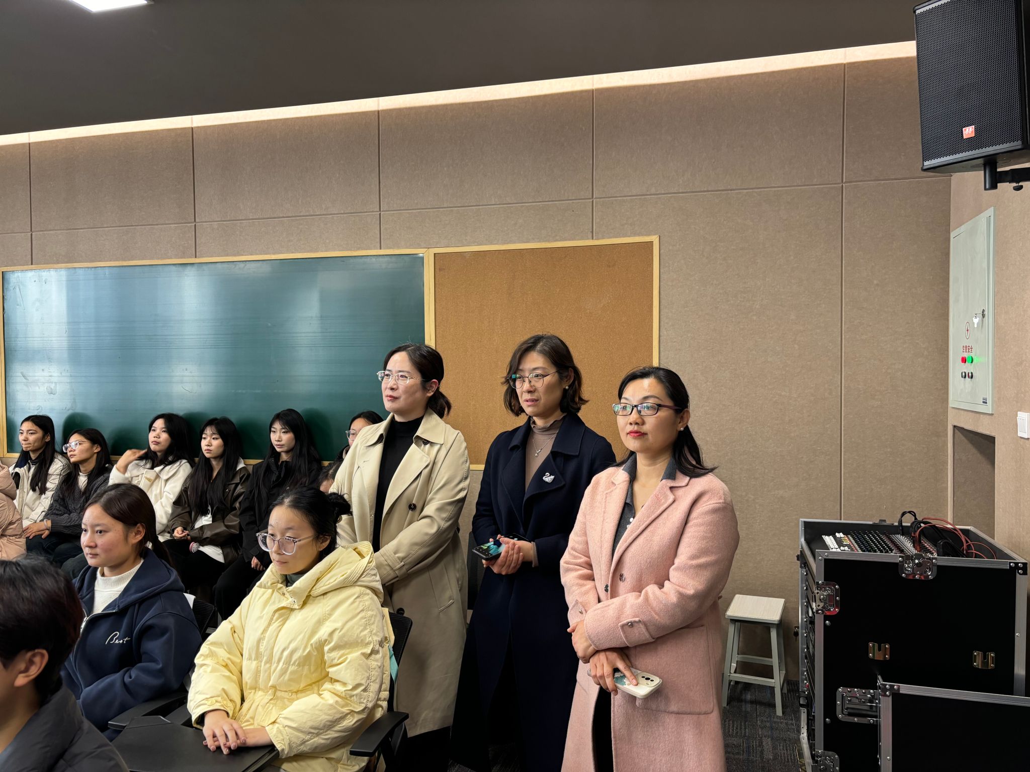 大赛现场,由主持人李梦珂和薛嘉嘉向大家介绍了此次到达现场的各位评委与老师。本次海报设计大赛共有12位优秀选手晋级决赛,以PPT的方式用三分钟的时间来讲解自己的作品设计理念,精彩的演讲和独特的设计让大家和评委眼前一亮。评委老师的提问环节更是深入探讨了作品的内涵和价值,她们从创新性、主题契合性、视觉效果、设计技巧等多个维度进行打分和评选。在竞赛举办期间,现代服务学院党总支书记白娜、院长许向蒲、副院长定琦也亲临现场,认真观看了选手们的作品展示和现场表现,与评委老师和参赛选手进行了亲切交流,她们对参赛选手的努力和创意给予了高度评价,同时也对大赛的组织工作表示充分肯定。经过激烈角逐和严格评审,大赛最终评选出了一等奖一名、二等奖两名、三等奖三名、以及优秀奖若干。