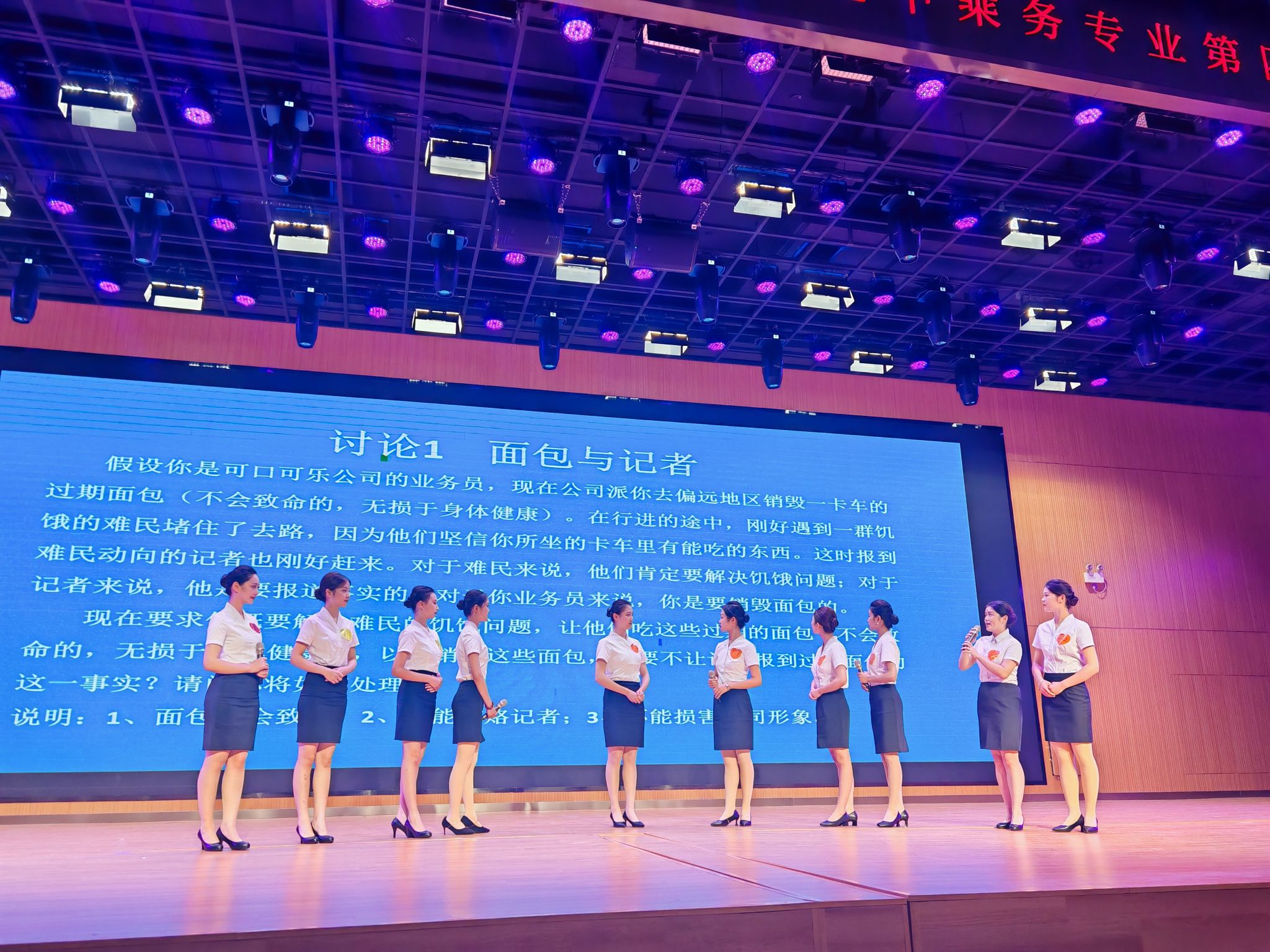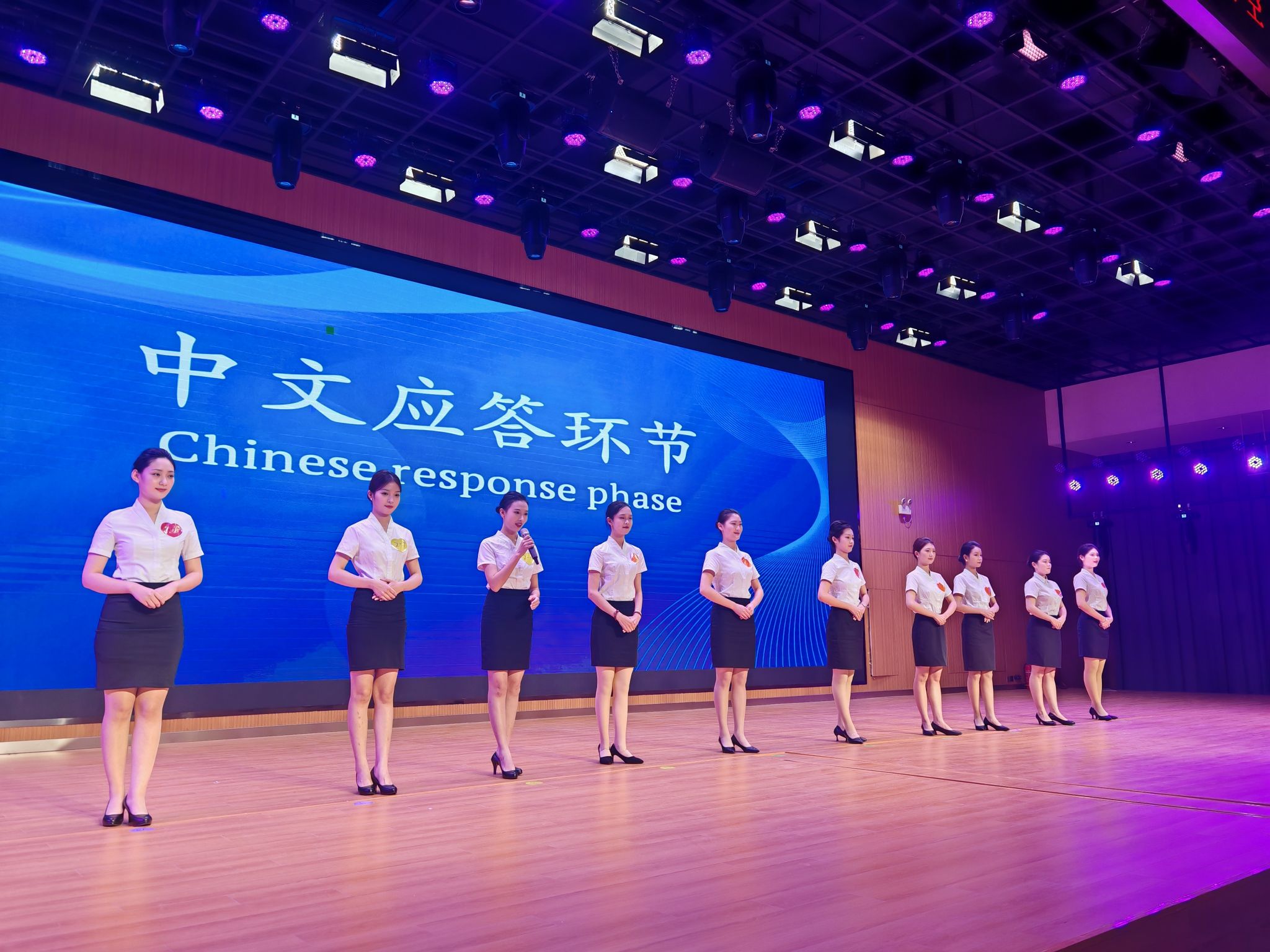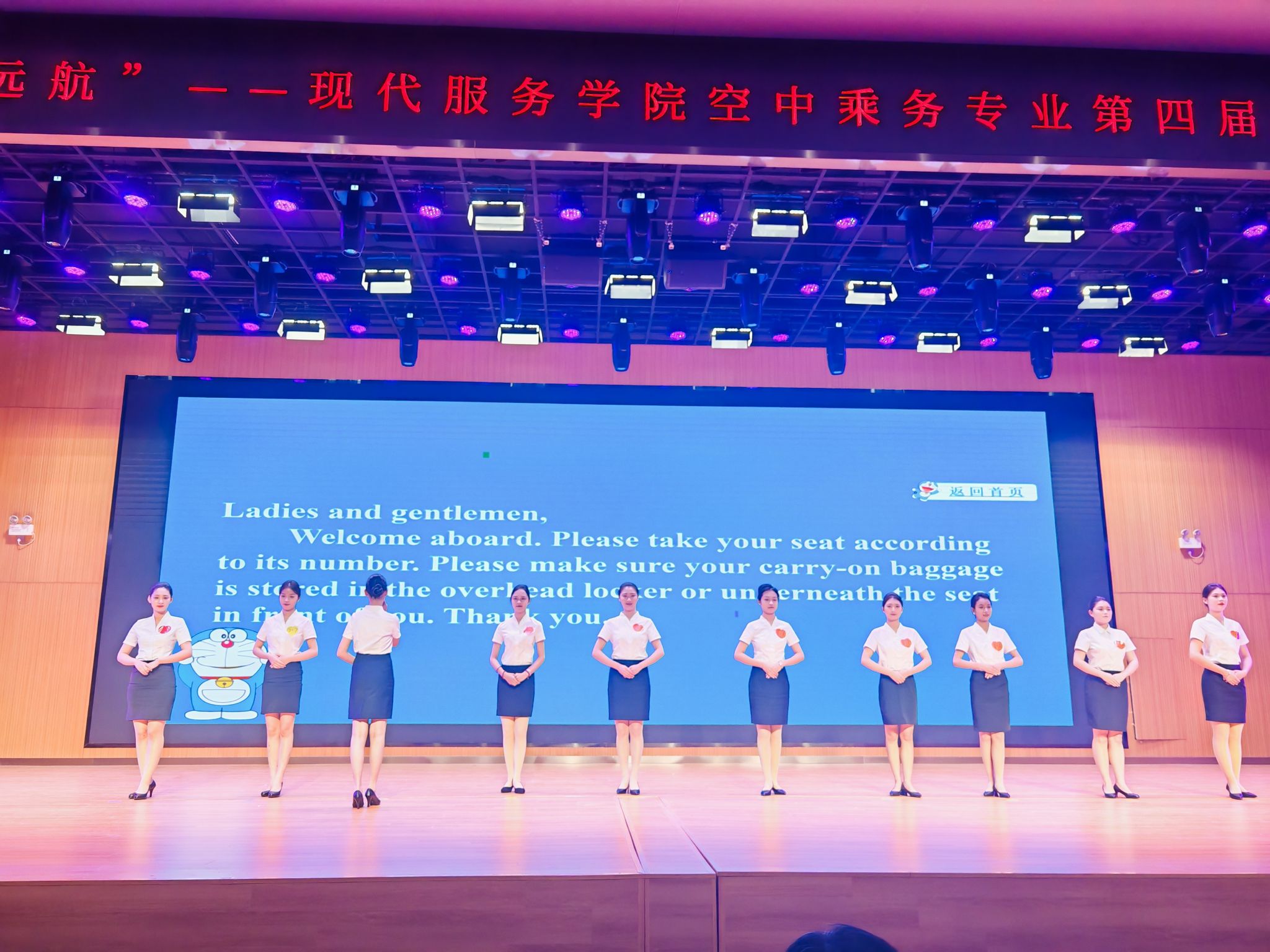 pp电子游戏平台网站党委书记王艳红、副校长张建军,教务处副处长田金毓,现代服务学院院长许向蒲、书记白娜、副院长定琦观摩了大赛,评委们由空中乘务专业资深教师:张莹、邵小明、蓝圆圆、贺河、李博宁、石帅、代天骄,以及人文学院专业教师苏雨珊组成,23级空中乘务1班的孙铭璇同学担任此次大赛的主持人,23、24级空乘专业的300多名学生齐聚一堂观摩与学习。