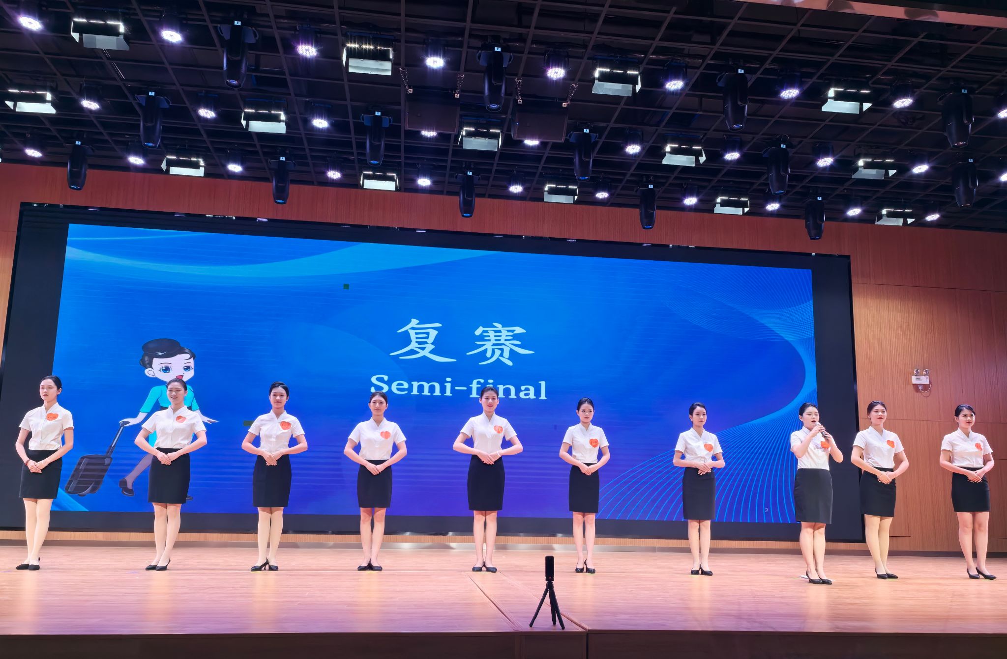 大赛现场,53名从初赛脱颖而出的学生们身着统一的制服,面带自信的微笑,仿佛置身于真实的航空公司面试现场。复赛环节为职业形象礼仪展示、中英文自我介绍、以及才艺展示。