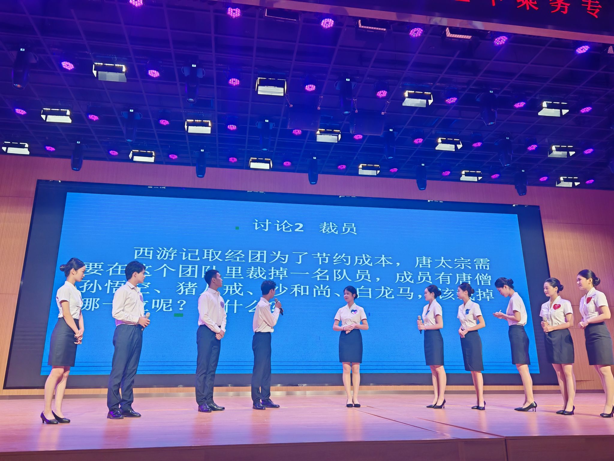 经过激烈角逐,20名同学进入最终决赛,决赛环节为机上广播词朗读、专业知识应答和无领导小组讨论,每一个环节都考验着学生们的专业素养和应变能力。