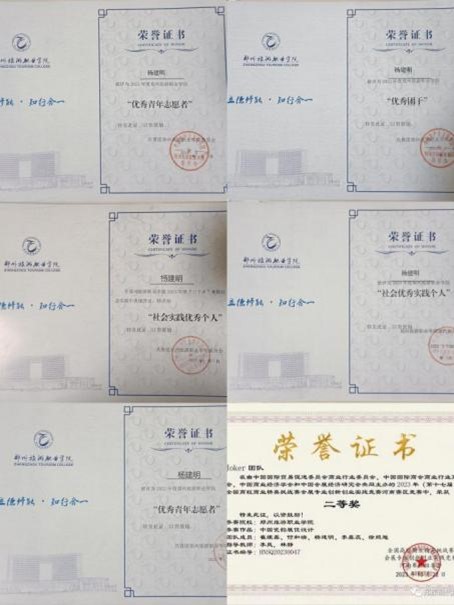 所获荣誉:2022年度pp电子游戏平台网站“优秀青年志愿者”;2023年度pp电子游戏平台网站“优秀团干”;2023年度pp电子游戏平台网站“优秀青年志愿者”;2023年度pp电子游戏平台网站“社会优秀实践个人”;2023年会展专业创新创业实践赛河南赛区“二等奖”。