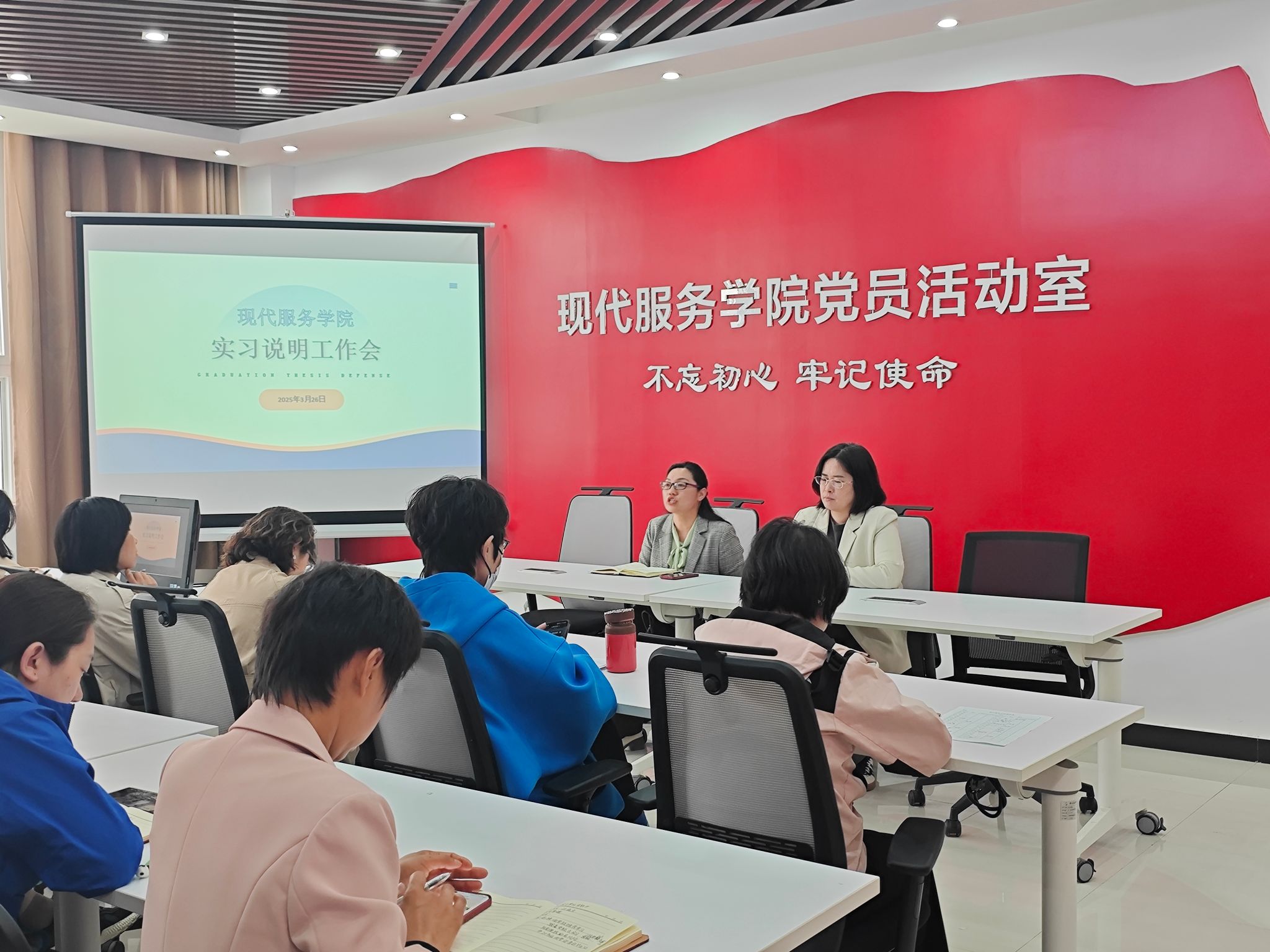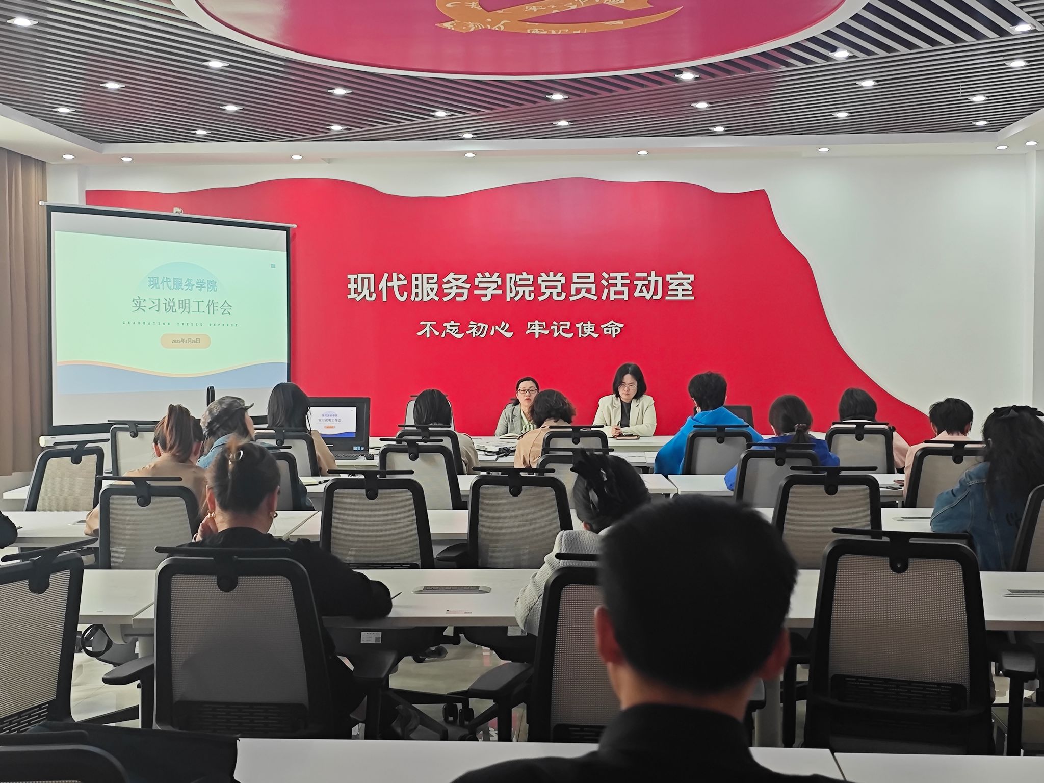 为进一步规范学生实习管理工作,确保学院实习工作顺利进行,提升实习工作的管理水平。现代服务学院于3月26日下午15:00在1A208教室召开了“2023级学生实习工作会”,会议由许向蒲院长主持,党总支书记白娜、副院长定琦及现代服务学院全体班主任参加会议。