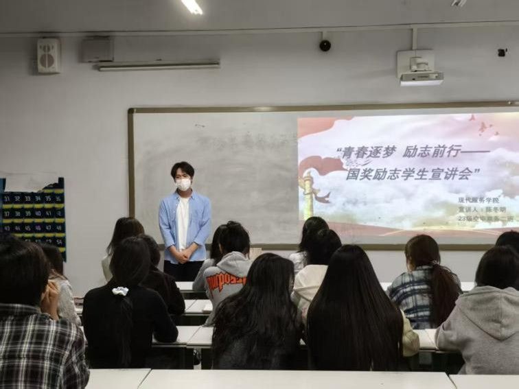 为充分发挥优秀学生在广大同学中的示范引领作用,以榜样的力量感染人、激励人,引导全院学生奋发自强、立志成才、感恩奉献,努力形成“物质帮助、精神激励、道德浸润、能力拓展”有效融合的资助育人长效机制,现代服务学院持续开展国奖励志奖学金学生宣讲会。3月30日晚,国家奖学金获得者陈冬明和国家励志奖学金获得者陈婧涵,在知新楼为24级学生代表开展了一场主题为“青春逐梦·励志前行”的宣讲活动。