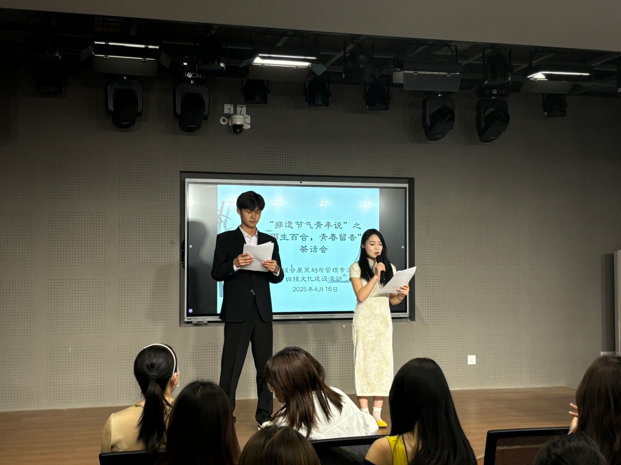 2025年4月16日,现代服务学院"非物质文化遗产节气青年说"系列活动之"雨生百谷·青春留香"茶话会暨24级会展策划与管理专业班级文化建设活动在学院报告厅圆满落幕。活动以谷雨节气为主题,通过文化科普、传统体验、创意互动与才艺展示四大板块,带领师生沉浸式感受中华传统文化的魅力。