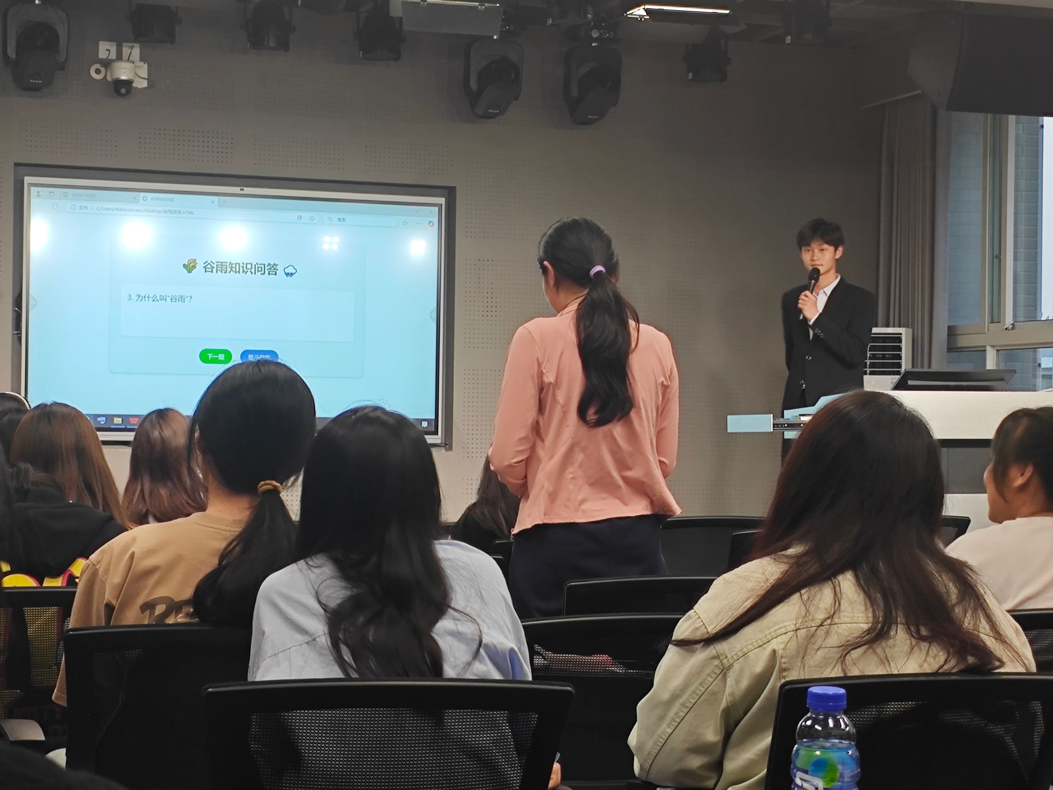 活动在主持人卢雨康、端木紫如的典雅开场中拉开帷幕。通过动画短片《谷雨的由来》,"仓颉造字""牡丹仙子"等传说故事生动展现了谷雨与中华农耕文明、民间信仰的深厚渊源。随后的习俗抢答环节以趣味互动形式普及"祭海神""食香椿"等传统知识,现场气氛热烈,学子们在知识碰撞中深化对节气文化的理解。