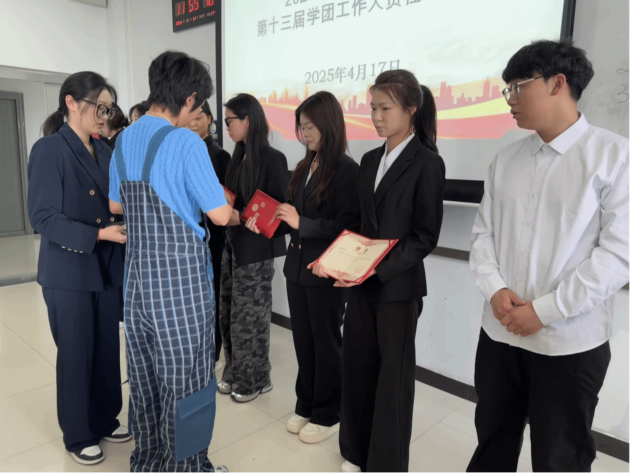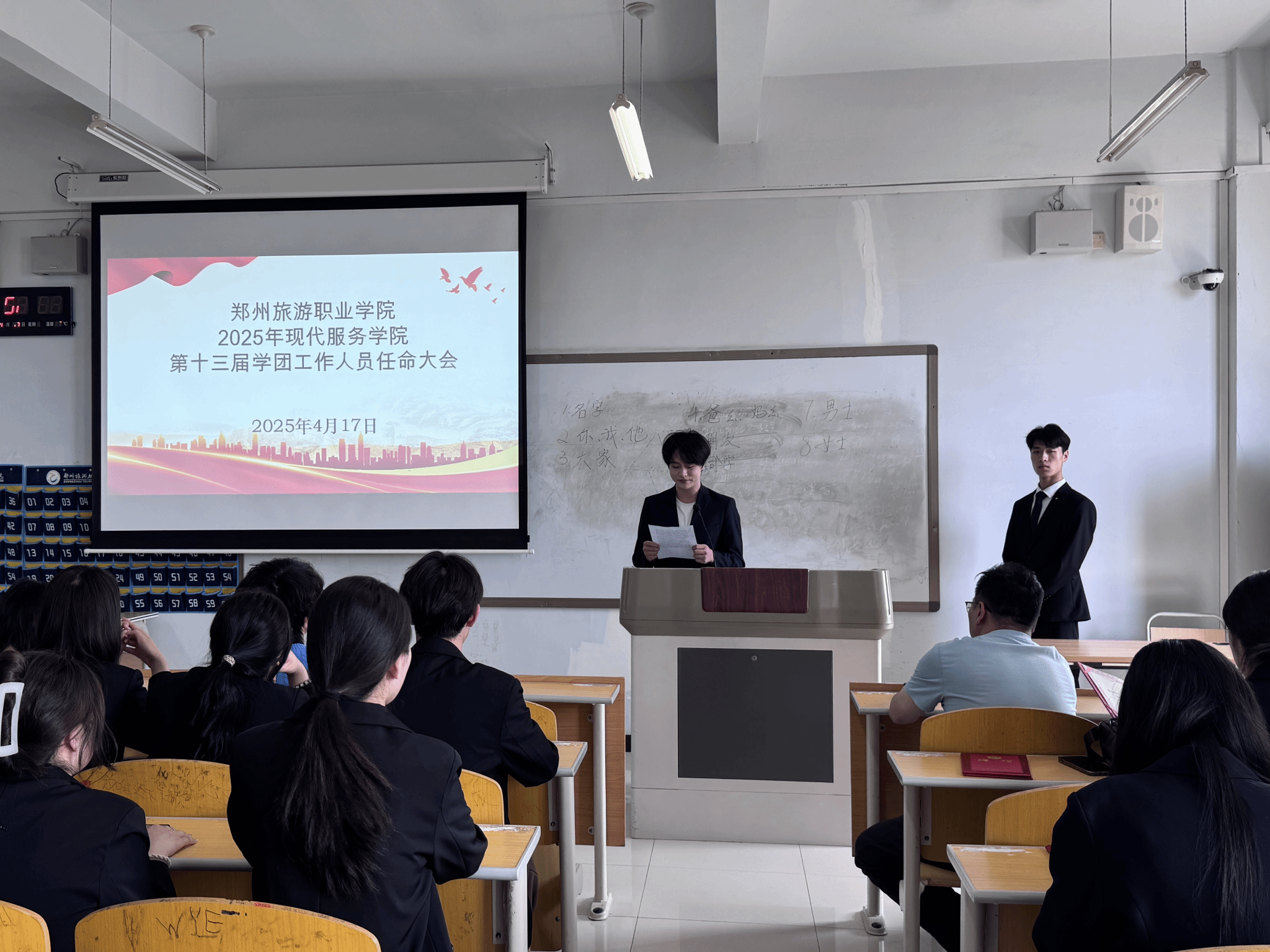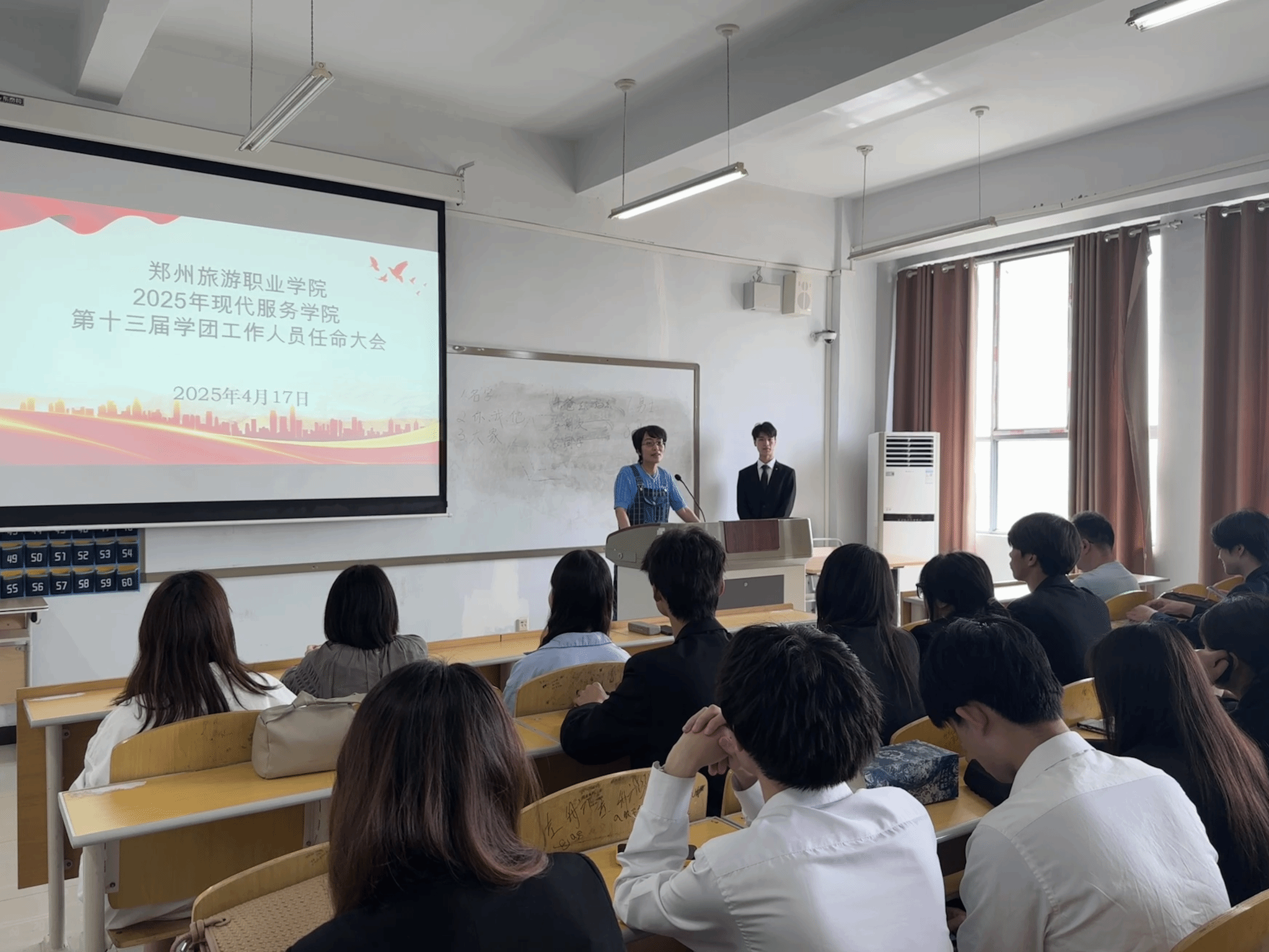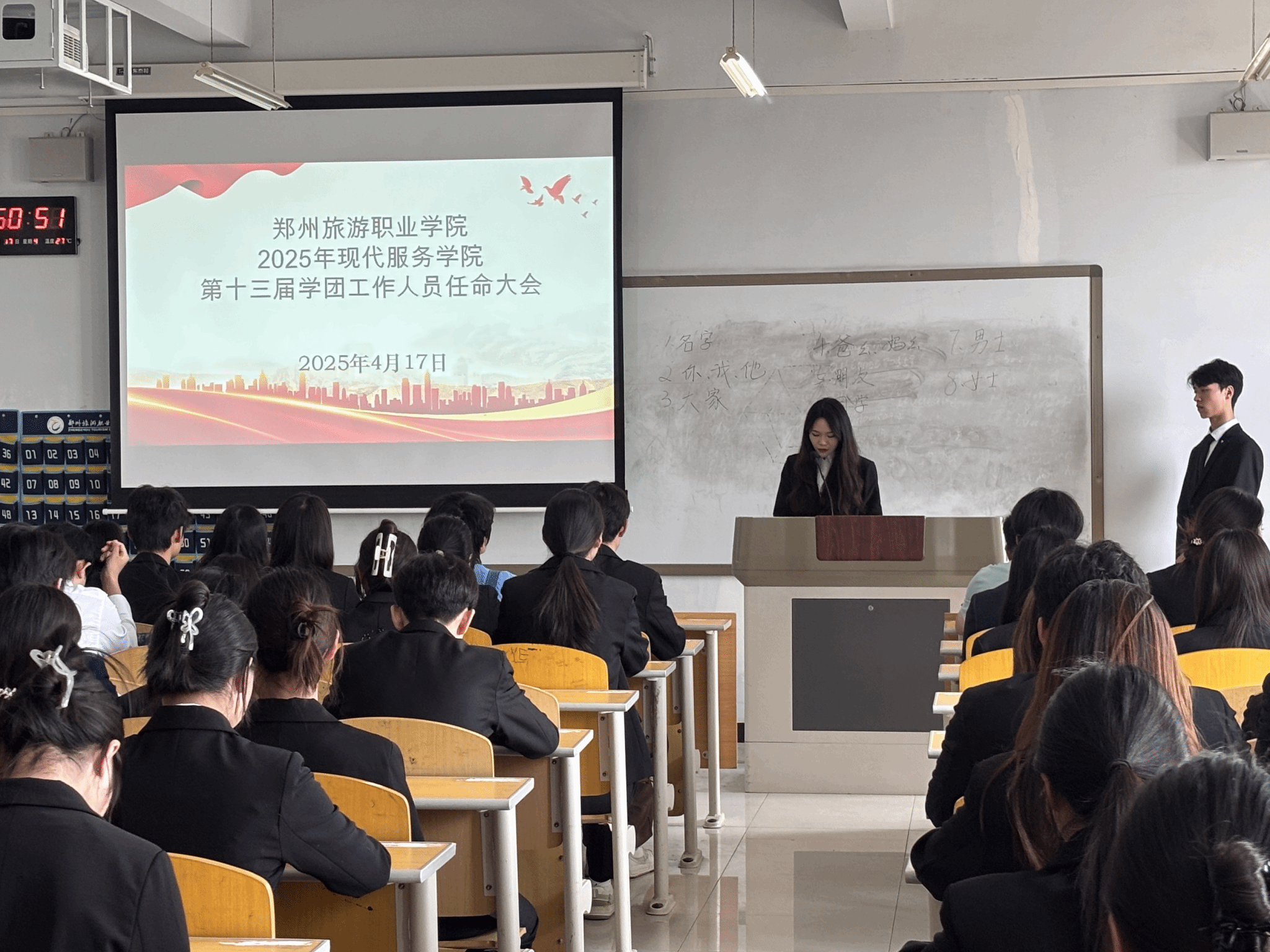 为进一步加强学团干部队伍建设,传承历史使命,为学团工作人员注入全新的青春活力,深入推进学团工作人员队伍的专业化进程,现代服务学院于2025年4月17日在1A505教室隆重召开了第十三届学团工作人员任命大会。出席本次会议的领导老师有现代服务学院党总支副书记岳正阳、团总支书记段会利、辅导员石帅、石艳春、刘好好。