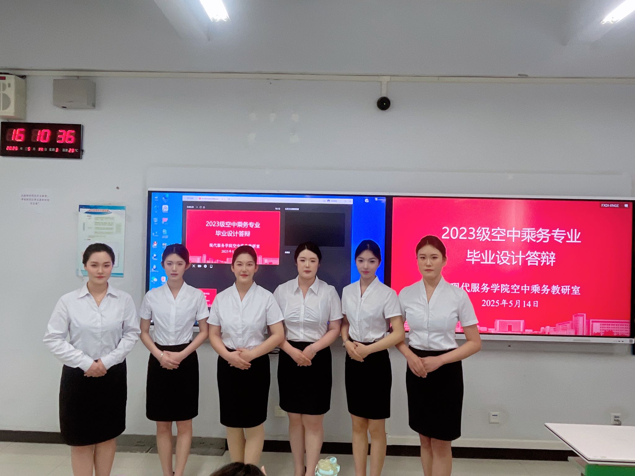 此次毕业设计答辩的成功举办,既是现代服务学院空中乘务专业教学成果的集中展示,也为专业发展指明了新方向。未来,空中乘务教研室将以此次活动为新起点,持续优化教学管理,深化教学改革,不断提升人才培养质量,为中国民航事业输送更多高素质专业人才。相信2023级空乘专业毕业生定能带着在校园中积累的知识与技能,在广阔的民航舞台上绽放光彩,书写属于自己的精彩篇章!