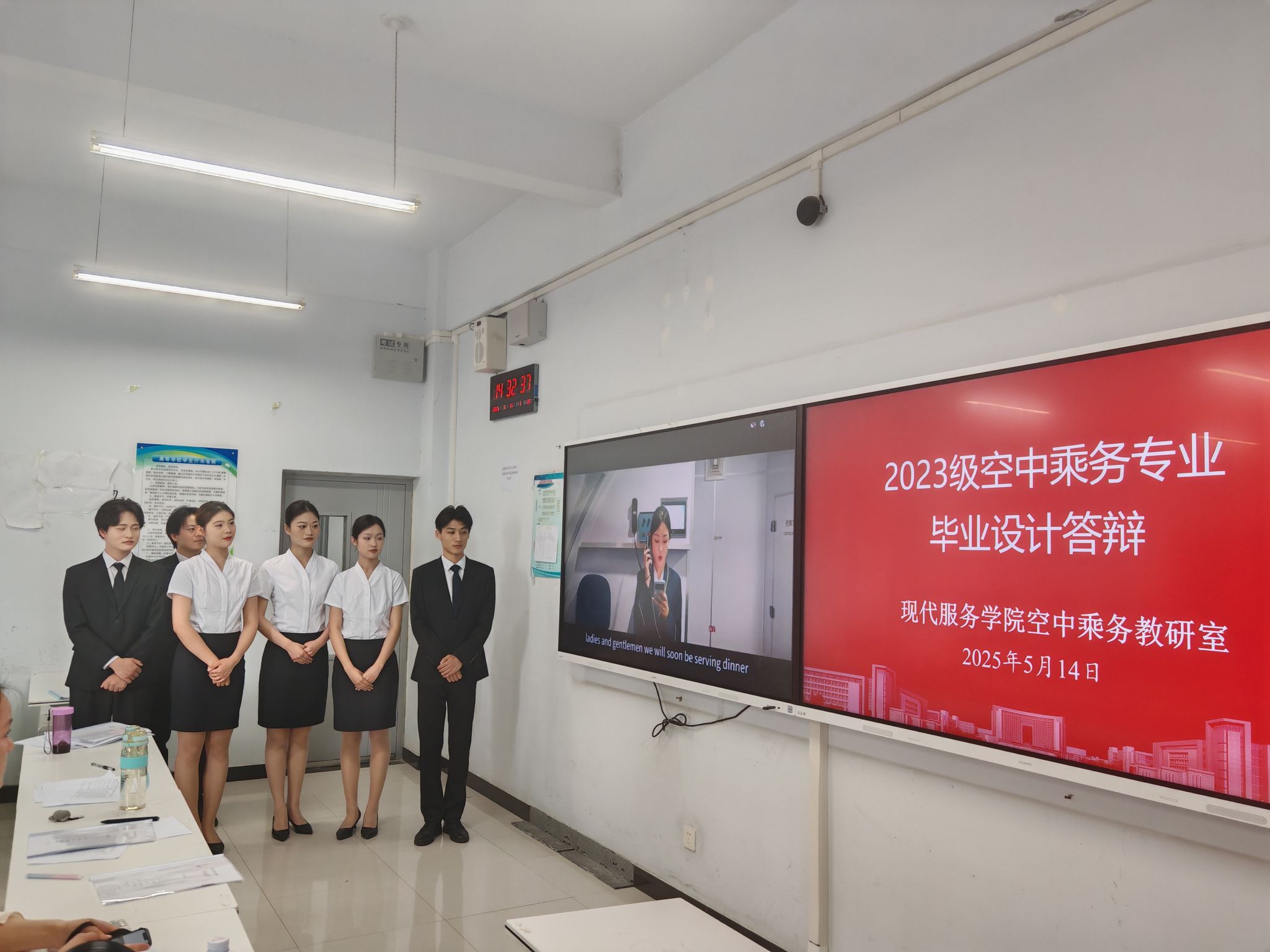 5月14日下午,现代服务学院2023级空中乘务专业毕业设计答辩活动顺利举行。学院院长许向蒲、副院长定琦、教研室主任张莹,以及邵小明、李博宁、代天娇、石帅等空中乘务专业教师分别在1A501和1A503教室担任评委,见证学子们的成长与蜕变。
