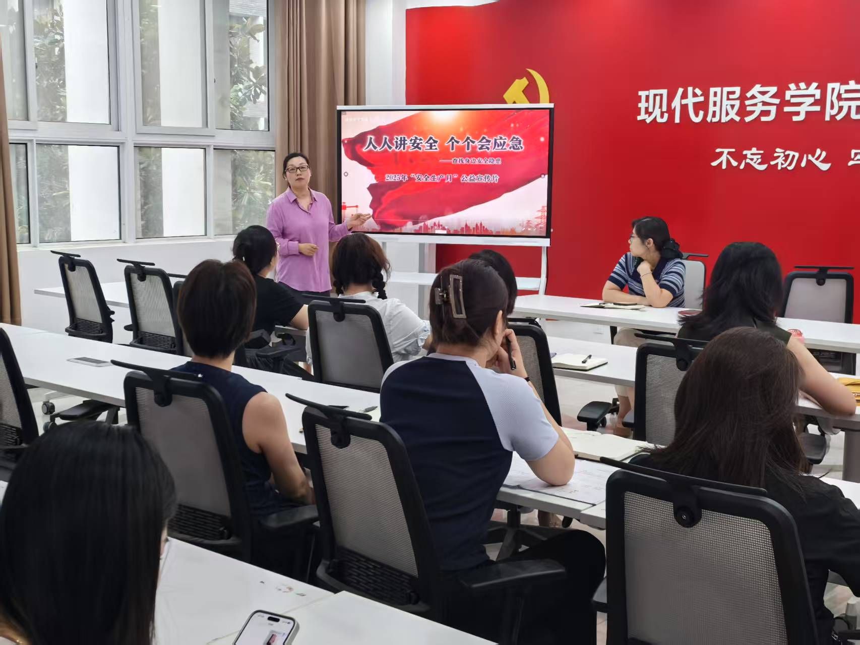 为深入贯彻落实国家安全生产方针政策,强化师生安全意识,提升应急处置能力,2025年6月18日现代服务学院以“人人讲安全、个个会应急—查找身边安全隐患”为主题,组织开展专题安全教育活动。本次活动由学院院长许向蒲主持并主讲,全体教职工参与。