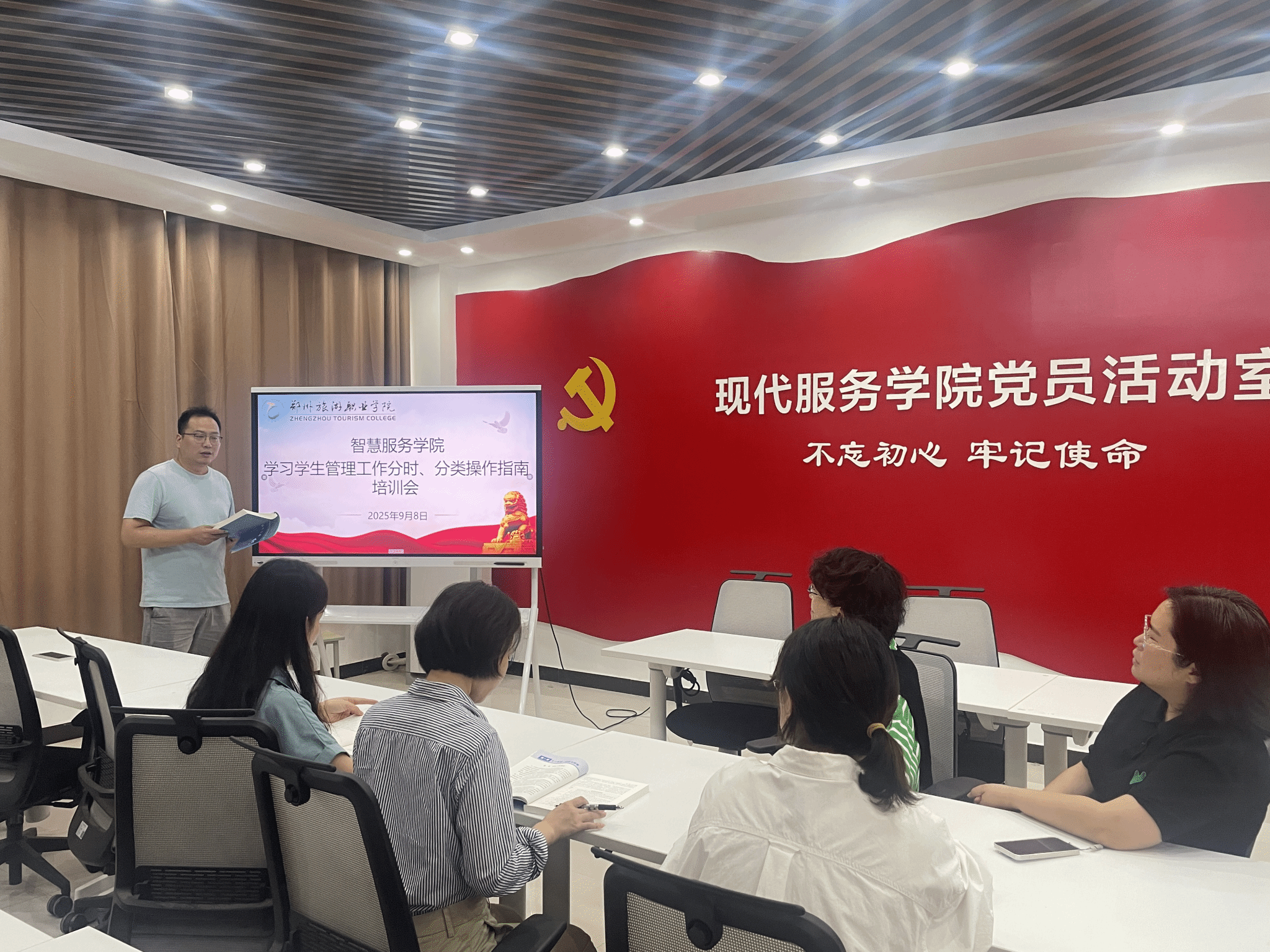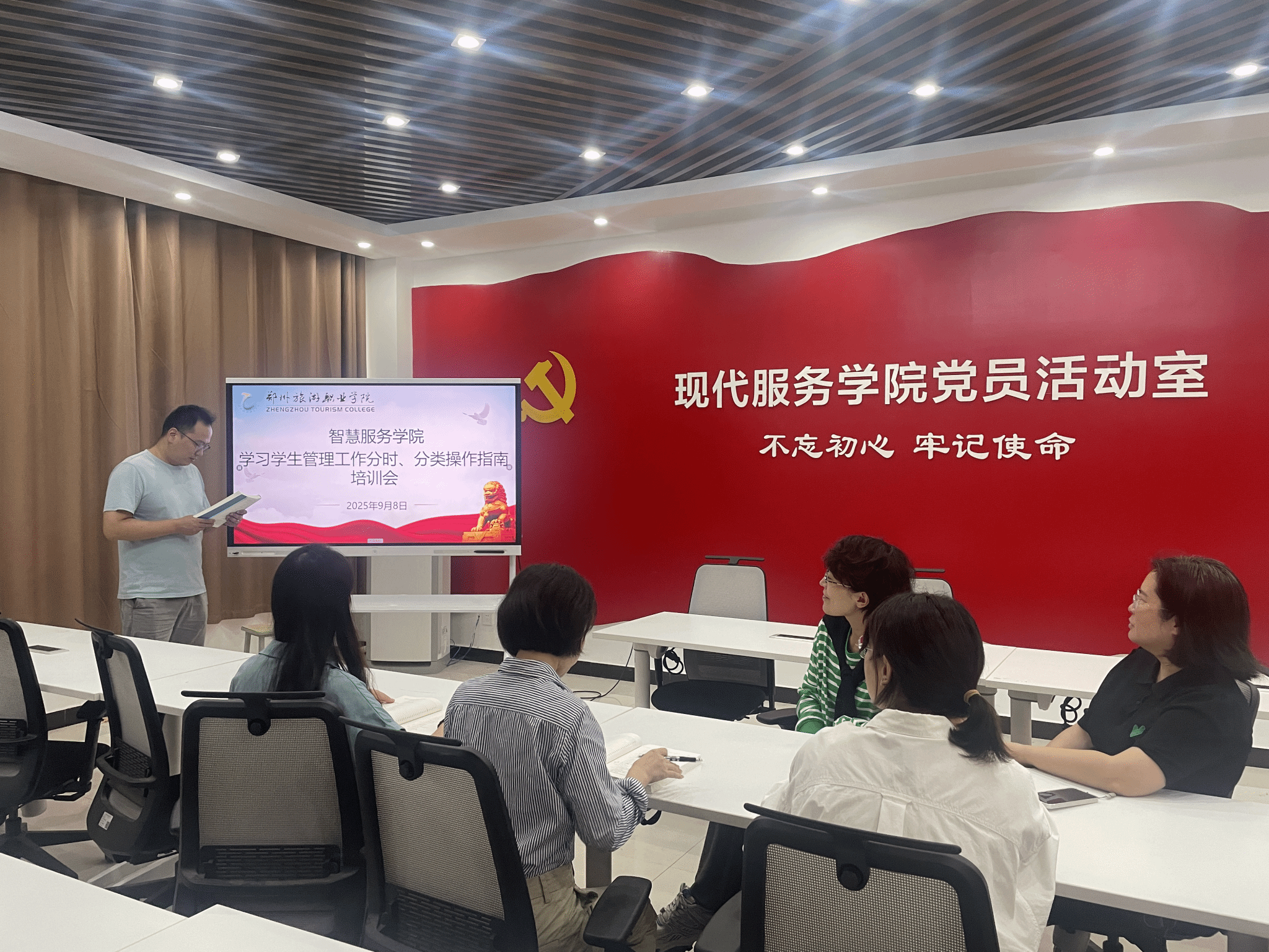 2025年9月8日,智慧服务学院在1A教学楼208会议室组织召开了《河南省本科高校学生管理工作分时、分类操作指南》专题培训会。学院党总支书记白娜、副书记岳正阳及全体专职辅导员参加了本次会议。