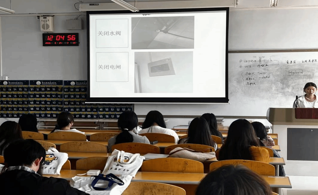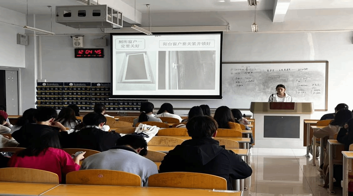 会议现场,通过PPT演示,以直观且细致的方式讲解假期安全要点。在寝室安全板块,重点强调了门窗锁闭规范——要求学生离校前务必将厕所窗户、阳台窗户关紧并锁好,从细节处杜绝安全隐患;同时明确需关闭水阀、电闸,切断水电源头,防止假期期间出现漏水、漏电等意外情况。针对出行安全,提醒学生合理规划行程,选择正规交通方式,避免前往人员密集的高危场所;对于留校学生,也倡导其遵守校园管理规定,保持规律作息,共同维护校园安全秩序。在消防安全方面,再次重申了校园内严禁使用违规电器、严禁私拉乱接电线的要求,强化学生的消防安全意识。