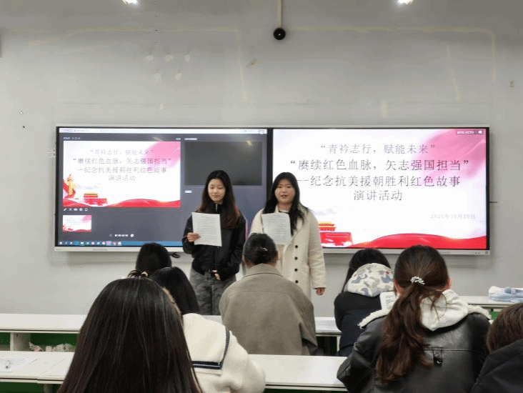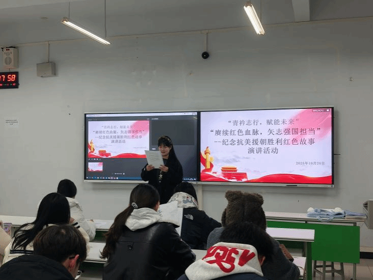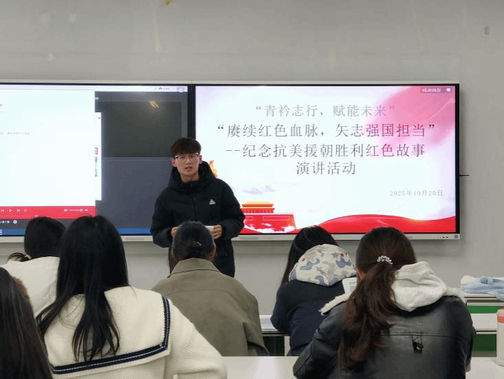 为纪念抗美援朝战争胜利,弘扬爱国主义精神,引导广大青年学生铭记历史、砥砺前行。2025年10月20日,智慧服务学院在1A501教室举办了“赓续红色血脉,矢志强国担当”纪念抗美援朝胜利红色故事演讲活动。