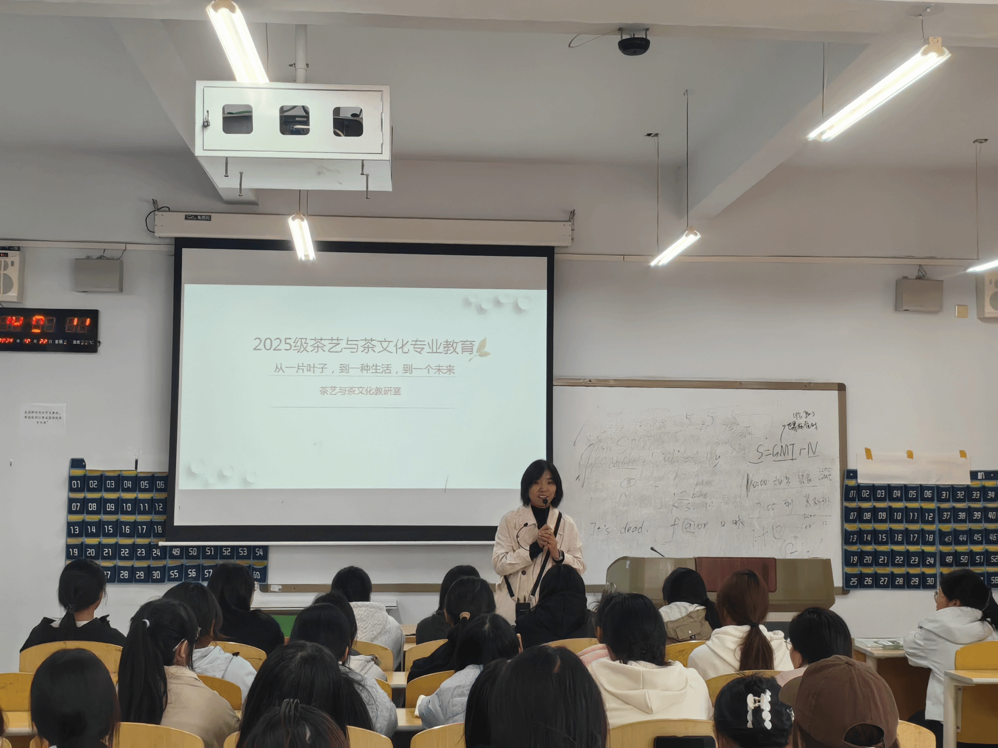 茶艺与茶文化专业教研室主任魏俊巧以“从一片叶子,到一种生活,到一个未来”的主题展开,系统介绍了本专业的专业发展历程、培养目标、课程体系、实习实训条件以及广阔的发展前景,并清晰展示了未来可从事的茶艺师、评茶员、茶企运营、茶旅策划等多元化岗位群。专业课教师杨茜、张钰老师分别介绍了自己教授的《茶叶基础知识》、《茶艺》等核心课程。她们从各自的教学领域出发,向同学们表达了殷切期望与美好祝福,鼓励新生珍惜大学时光,沉心静气,在茶香中探寻学问、锤炼匠心,为未来的职业发展奠定坚实基础。活动中茶艺专业优秀的在岗实习生和已毕业的学长学姐通过精心准备的视频,从全国各地为学弟学妹们送来了暖心祝福与宝贵建议。他们结合自身的学习和工作经历,分享了在校期间如何高效学习、参与实践的经验,其真挚的话语引起了在场新生的强烈共鸣。